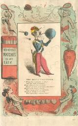 | Keywords: library company of philadelphia librarycompanyofphiladelphia united states unitedstates history civil war civilwar 1861-1865 18611865 soldiers cartoons wit humor drawing text writing sketch painting illustration cartoon The first line quotes from Charles Carroll Sawyer's sentimental Civil War ballad, "When this cruel war is over." The valentine shows a Union soldier lighting his cigarette from a bomb as bombs fly in the background behind him. The border features matches, a heart-shaped beet, and cherubs playing tennis and tug o' war. The label on the matchbox reads "Red-headed matches go off easy," and the beet is marked "D.B." [i.e. "dead beat" or "dead beet"]. The first line quotes from Charles Carroll Sawyer's sentimental Civil War ballad, "When this cruel war is over." The valentine shows a Union soldier lighting his cigarette from a bomb as bombs fly in the background behind him. The border features matches, a heart-shaped beet, and cherubs playing tennis and tug o' war. The label on the matchbox reads "Red-headed matches go off easy," and the beet is marked "D.B." [i.e. "dead beat" or "dead beet"]. |