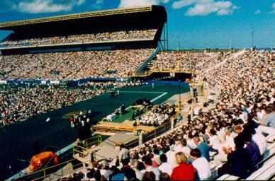 | Keywords: mennonite world conference mennoniteworldconference winnipeg manitoba canada outdoor Caption: When we negotiated the rental of the stadium for this Sunday service, we were told in no uncertain terms that the policy of Winnipeg Enterprizes would not allow the audience to congregate on the turf. So we planned for everybody to be seated in the east, west and north stands, or on the south end grass. Soon, though the cold winds on the east side drove them down to the more sheltered and warmer turf area. We could not stop them. Our friend, the Stadium Operations Manager, Rod Thiessen, first closed one eye, then both, and we let it happen. Eventually a mass of people on the turf formed a bridge between the widely separated stands. We had physically become one. But even more significantly, we had through the week and on this Sunday morning become one in the Spirit. I was reminded of the song we sang in 1984 at Strasbourg: "In Christ there is no East or West, in Him no South or North; But one great fellowship of love Throughout the whole wide earth. In Him shall true hearts everywhere There high communion find His service is the golden cord Close binding all mankind." Citation: Mennonite World Conference. Twelfth Mennonite World Conference, 1990, Winnipeg, Canada. Slides by T. Klassen; Script by John Dyck. X-9 Box 52 Folder 4 Slide 136. Mennonite Church USA Archives - Goshen. Goshen, Indiana. Caption: When we negotiated the rental of the stadium for this Sunday service, we were told in no uncertain terms that the policy of Winnipeg Enterprizes would not allow the audience to congregate on the turf. So we planned for everybody to be seated in the east, west and north stands, or on the south end grass. Soon, though the cold winds on the east side drove them down to the more sheltered and warmer turf area. We could not stop them. Our friend, the Stadium Operations Manager, Rod Thiessen, first closed one eye, then both, and we let it happen. Eventually a mass of people on the turf formed a bridge between the widely separated stands. We had physically become one. But even more significantly, we had through the week and on this Sunday morning become one in the Spirit. I was reminded of the song we sang in 1984 at Strasbourg: "In Christ there is no East or West, in Him no South or North; But one great fellowship of love Throughout the whole wide earth. In Him shall true hearts everywhere There high communion find His service is the golden cord Close binding all mankind." Citation: Mennonite World Conference. Twelfth Mennonite World Conference, 1990, Winnipeg, Canada. Slides by T. Klassen; Script by John Dyck. X-9 Box 52 Folder 4 Slide 136. Mennonite Church USA Archives - Goshen. Goshen, Indiana. |