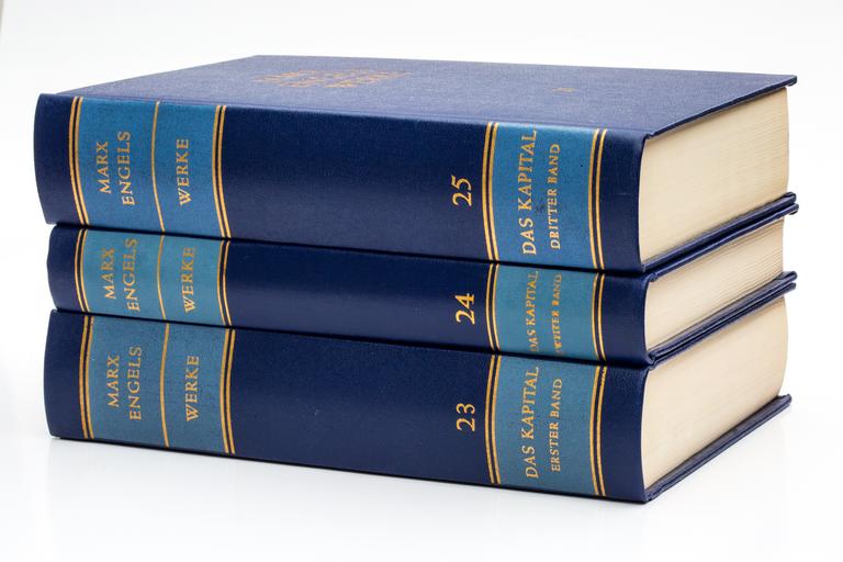 Keywords: the capital book karl marx karl marx friedrich angel friedrich engels classic marxism-leninism blue thick historically criticism read study old book literature bookcase cover front and back covers gold embossing gold textbook science everlasting up-to-date philosophy capitalism communism revolution socialism