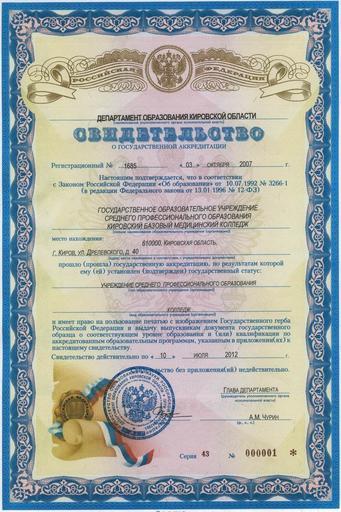 Keywords: The certificate of state accreditation of MCK.jpg en The certificate of state accreditation of Medical college of Kirov ru Свидетельство о госуда ственной акк едитации Ки овского медицинского колледжа http //kbmk kirov ru/akk html 2007 Medical college of Kirov PD-RU-exempt |