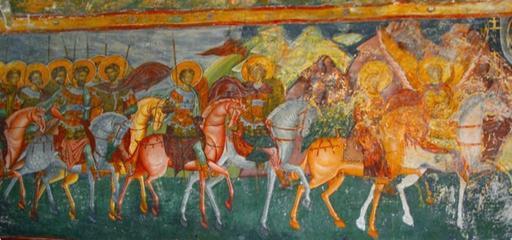 | Keywords: The church of the Holy Cross of Pătrăuţi 01.jpg  Импе ато Константин со святыми вио нами следуют за а хангелом  ихаилом Ф еска це кви святого К еста в Пэт эуци Румыния scan from tourist book end of XV c anonimus Frescos of Christian saints PD-Art |