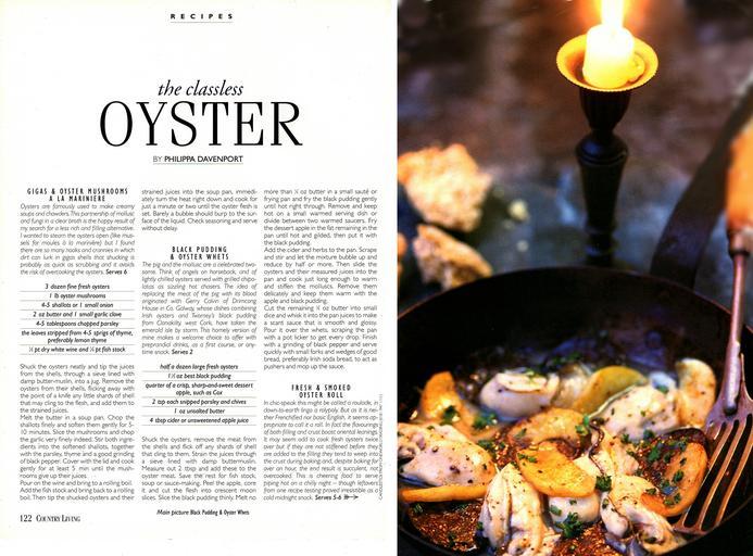 | Keywords: recipes food text seafood shellfish oysters savoury country living countryliving cooking scanned Article and recipes using fresh oysters - gigas and native British. 3 pages - 1x2+1 Article and recipes using fresh oysters - gigas and native British. 3 pages - 1x2+1 |