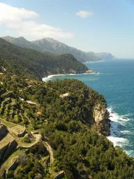 Keywords: the coast sea landscape water rock cliff turbot nature the stones tree the bushes the cliffs the waves rocks the waterfront majorca spain seaside vegetation