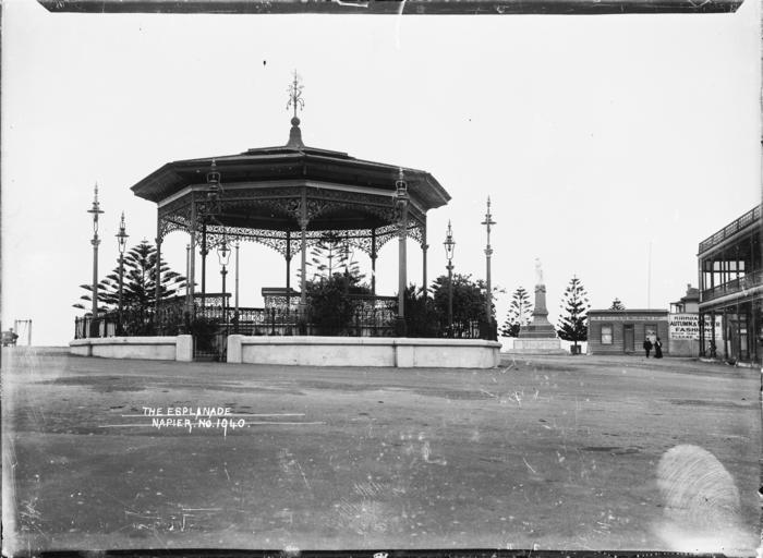 Keywords: blackandwhite monochrome outdoor black and white View of Marine Parade, Napier. The band rotunda in the centre has wrought-iron tracery around the top and beneath the railings. There are street lamps around the rotunda, the South African War memorial is to the right, and the premises of the New Zealand Accident Insurance Company on the right again. Photograph taken by William Archer Price, circa 1910s Inscriptions: Inscribed - Photographer's title on negative -bottom left: The Esplanade. Napier. No. 1940. Quantity: 1 b&w original negative(s). Physical Description: Dry plate glass negative 4.5 x 6.5 inches The Esplanade (Marine Parade) at Napier. Price, William Archer, 1866-1948 :Collection of post card negatives. Ref: 1/2-001380-G. Alexander Turnbull Library, Wellington, New Zealand. natlib.govt.nz/records/23040553 View of Marine Parade, Napier. The band rotunda in the centre has wrought-iron tracery around the top and beneath the railings. There are street lamps around the rotunda, the South African War memorial is to the right, and the premises of the New Zealand Accident Insurance Company on the right again. Photograph taken by William Archer Price, circa 1910s Inscriptions: Inscribed - Photographer's title on negative -bottom left: The Esplanade. Napier. No. 1940. Quantity: 1 b&w original negative(s). Physical Description: Dry plate glass negative 4.5 x 6.5 inches The Esplanade (Marine Parade) at Napier. Price, William Archer, 1866-1948 :Collection of post card negatives. Ref: 1/2-001380-G. Alexander Turnbull Library, Wellington, New Zealand. natlib.govt.nz/records/23040553 |