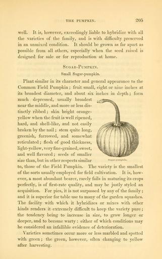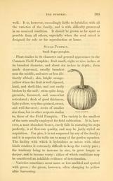 | Keywords: The field and garden vegetables of America (Page 205) (6002641544).jpg THE PUMPKIN <br> 205 <br> well It is however exceedingly liable to hybridize with all <br> the varieties of the family and is with difficulty preserved <br> in an unmixed condition It should be grown as far apart as <br> possible from all others especially when the seed raised is <br> designed for sale or for reproduction at home <br> Sugar-Pumpkin <br> Small Sugar-pumpkin <br> Plant similar in its character and general appearance to the <br> Common Field Pumpkin ; fruit small eight or nine inches at <br> its broadest diameter and about six inches in depth ; form <br> much depressed usually broadest <br> near the middle and more or less dis- <br> tinctly ribbed; skin bright orange- <br> yellow when the fruit is well ripened <br> hard and shell-like and not easily <br> broken by the nail ; stem quite long <br> greenish furrowed and somewhat <br> reticulated ; flesh of good thickness <br> light-yellow very fine-grained sweet <br> and well flavored ; seeds of smaller <br> size than but in other respects similar <br> to those of the Field Pumpkin The variety is the smallest <br> of the sorts usually employed for field cultivation It is how- <br> ever a most abundant bearer rarely fails in maturing its crops <br> perfectly is of first-rate quality and may be justly styled an <br> acquisition For pies it is not surpassed by any of the family ; <br> and it is superior for table use to many of the garden squashes <br> The facility with which it hybridizes or mixes with other <br> kinds renders it extremely difficult to keep the variety pure ; <br> the tendency being to increase in size to grow longer or <br> deeper and to become warty either of which conditions may <br> be considered an infallible evidence of deterioration <br> Varieties sometimes occur more or less marbled and spotted <br> with green ; the green however often changing to yellow <br> after harvesting <br> r-pimipkii 29062543 92326 42073 Page 205 Text http //www biodiversitylibrary org/page/29062543 1863 10 5962/bhl title 42073 Burr Fearing Biodiversity Heritage Library The field and garden vegetables of America United States Varieties Vegetable gardening Vegetables Library Congress bhl page 29062543 dc identifier http //biodiversitylibrary org/page/29062543 united states Information field Flickr posted date ISOdate 2011-08-02 CC-BY-2 0 BioDivLibrary https //flickr com/photos/61021753 N02/6002641544 2015-09-10 20 55 52 cc-by-2 0 PD-old-70-1923 The field and garden vegetables of America Photos uploaded from Flickr by Fæ using a script |
