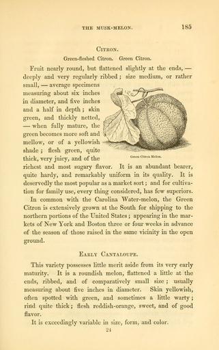 | Keywords: The field and garden vegetables of America (Page 185) (6002640882).jpg  THE MUSK-MELON <br> 185 <br> Green Citron Melon <br> Citron <br> Green-fleshed Citron Green Citron <br> Fruit nearly round but flattened slightly at the ends  <br> deeply and very regularly ribbed ; size medium or rather <br> small  average specimens <br> measuring about six inches <br> in diameter and five inches <br> and a half in depth ; skin <br> green and thickly netted <br>  when fully mature the <br> green becomes more soft and <br> mellow or of a yellowish <br> shade ; flesh green quite <br> thick very juicy and of the <br> richest and most sugary flavor It is an abundant bearer <br> quite hardy and remarkably uniform in its quality It is <br> deservedly the most popular as a market sort ; and for cultiva- <br> tion for family use every thing considered has few superiors <br> In common with the Carolina Water-melon the Green <br> Citron is extensively grown at the South for shipping to the <br> northern portions of the United States ; appearing in the mar- <br> kets of New York and Boston three or four weeks in advance <br> of the season of those raised in the same vicinity in the open <br> ground <br> Eakly Cantaloupe <br> This variety possesses little merit aside from its very early <br> maturity It is a roundish melon flattened a little at the <br> ends ribbed and of comparatively small size ; usually <br> measuring about five inches in diameter Skin yellowish <br> often spotted with green and sometimes a little warty ; <br> rirtd quite thick; flesh reddish-orange sweet and of good <br> flavor <br> It is exceedingly variable in size form and color <br> 24 29062523 92326 42073 Page 185 Text http //www biodiversitylibrary org/page/29062523 1863 10 5962/bhl title 42073 Burr Fearing Biodiversity Heritage Library The field and garden vegetables of America United States Varieties Vegetable gardening Vegetables Library Congress bhl page 29062523 dc identifier http //biodiversitylibrary org/page/29062523 united states Information field Flickr posted date ISOdate 2011-08-02 CC-BY-2 0 BioDivLibrary https //flickr com/photos/61021753 N02/6002640882 2015-09-10 20 59 22 cc-by-2 0 PD-old-70-1923 The field and garden vegetables of America Photos uploaded from Flickr by FĂŚ using a script |