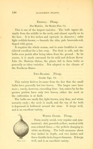 | Keywords: The field and garden vegetables of America (Page 140) (6002093135).jpg 140 ALLIACEOUS PLANTS <br> Tripoli Thomp <br> Flat Madeira De Madere Plat Vil <br> This is one of the largest varieties The bulb tapers ab- <br> ruptly from the middle to the neck and almost equally so to <br> the base It is five inches and upwards in diameter ; color <br> light reddish-brown ” beneath the skin pale brownish-red <br> tinged with green <br> It requires the whole season and in some localities is con- <br> sidered excellent for a late crop The flesh is soft and the <br> bulbs soon perish after being taken from the ground In its <br> season it is much esteemed for its mild and delicate flavor <br> Like the Madeira Onion the plants fail to form bulbs so <br> generally as other varieties Not adapted to the climate of <br> the Northern States <br> Two-Bladed Thomp <br> Double Tige Vil <br> This variety derives its name from the fact that the small <br> bulbs have generally but two leaves The larger ones have <br> more ; rarely however exceeding four but unless by far the <br> greater portion have only two leaves either the seed or <br> the cultivation is at fault <br> The bulbs are small flat light-brown very firm and attain <br> maturity early ; the neck is small and the top of the bulb <br> is depressed or hollowed around the stem It keeps well <br> and is an excellent variety <br> White Globe Thomp <br> Form nearly ovoid very regular and sym- <br> metrical ; skin greenish-yellow marked with <br> rose-colored lines ” the pellicle changing to <br> white on drying The bulb measures about <br> four inches in depth and two inches and <br> three-fourths in its largest diameter It keeps <br> white Giobc well and is an excellent variety 29062478 92326 42073 Page 140 Text http //www biodiversitylibrary org/page/29062478 1863 10 5962/bhl title 42073 Burr Fearing Biodiversity Heritage Library The field and garden vegetables of America United States Varieties Vegetable gardening Vegetables Library Congress bhl page 29062478 dc identifier http //biodiversitylibrary org/page/29062478 united states Information field Flickr posted date ISOdate 2011-08-02 CC-BY-2 0 BioDivLibrary https //flickr com/photos/61021753 N02/6002093135 2015-09-10 21 02 44 cc-by-2 0 PD-old-70-1923 The field and garden vegetables of America Photos uploaded from Flickr by Fæ using a script |