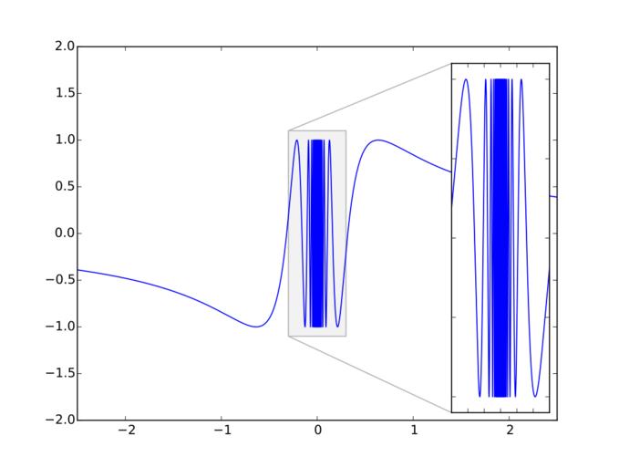 | Keywords: The function sin(1 over x).svg en The function <math>f x \R\to\R x\mapsto \begin cases \sin\left \tfrac 1x\right x \neq 0 \\ 0 x 0 \end cases </math> 2016-04-23 own http //kulla me Stephan Kulla User Stephan Kulla other versions <gallery> The function sin 1 over x svg Graph of function sin 1 over x The function x sin 1 over x svg Graph of function x sin 1 over x The function x 2 sin 1 over x svg Graph of function x 2 sin 1 over x </gallery> Other fields Matplotlib + import matplotlib pyplot as plt import numpy as np from mpl_toolkits axes_grid1 inset_locator import zoomed_inset_axes mark_inset xs1 np linspace -3 3 10001 xs2 1/ np arange 1 1001 1 np pi/2 xs np union1d np union1d xs1 xs2 -xs2 ys np sin 1/xs f ax plt subplots ax plot xs ys ax set_xlim -2 5 2 5 ax set_ylim -2 2 axins zoomed_inset_axes ax 1 7 loc 4 axins plot xs ys axins set_xlim -0 3 0 3 axins set_ylim -1 1 1 1 mark_inset ax axins loc1 3 loc2 2 fc 0 95 ec 0 7 plt xticks visible False plt yticks visible False plt savefig The function sin 1 over x svg cc-zero Continuity functions Trigonometric functions |
