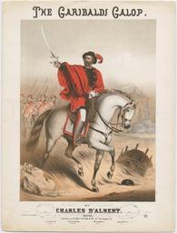 | Keywords: The Garibaldi Galop..jpg en Music cover sheet Garibaldi on horseback directed to right with head turned to look to left wearing a plumed hat and red drape around his shoulders over a double-breasted black coat his right arm outstretched holding up a sword in his hand followed by a group of armed soldiers at left; basket at right a lake or river behind trees on the opposite shore and hills in the distance; outer border surrounding image Lithograph printed in colour with additional hand-colouring 1841-1863 circa http //dl lib brown edu/repository2/repoman php verb render id 1203090270796875 http //www britishmuseum org/research/search_the_collection_database/search_object_details aspx objectid 3291067 partid 1 searchText garibaldi fromADBC ad toADBC ad numpages 10 images on orig 2fresearch 2fsearch_the_collection_database aspx currentPage 2 Print made by John Brandard PD-Art Uploaded with UploadWizard Giuseppe Garibaldi Galop |