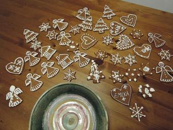 Keywords: the gingerbread christmas painted garnished with little angel sapling bowl table christmas time sweets pastry gingerbread holiday snowflake star