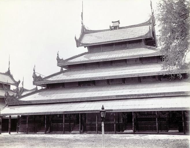 | Keywords: The Glass Palace, Mandalay.jpg en Photograph of the Glass Palace in the Nandaw Royal Palace at Mandalay in Burma Myanmar from the Archaeological Survey of India Collections Burma Circle 1903-07 The photograph was taken by an unknown photographer in 1903 under the direction of Taw Sein Ko the Superintendent of the Archaeological Survey of Burma at the time The Glass Palace was a pavilion situated in the centre of the Royal Palace in the middle of a sequence of state rooms leading from the Great Hall of Audience at the eastern end of the palace facing the main city gate of Mandalay towards the private women ™s apartments occupied by queens of various rank at the western end of the palace This arrangement followed the Burmese tradition of building palaces monasteries and houses on an east-west axis The Glass Palace was the principal apartment in the Palace It was divided into two rooms The west room was the living space and bed chamber of the King The east room contained the Bee Throne one of eight in the palace and was the location for the ceremony for the nomination of the Chief Queen the celebration of the Royal nuptials and of the Burmese New Year feast among others In his Guide to the Mandalay Palace Rangoon 1925 a later Superintendent of the Burma Archaeological Survey Charles Duroiselle wrote that it was the largest and one of the most beautiful apartments of the Palace When this apartment was new and freshly decorated and gilt it must have been with its iron trellis work covered with glass mosaic work corruscating in the ambient light a very great sight The palace is crowned with a tiered roof a symbolic form demarcating sacred space which was restricted to royal and religious architecture The Royal Palace stood at the centre of Mandalay a walled city founded in 1857 which became Burma ™s last great royal capital It was one of the first buildings to be constructed re-using many parts of the teak buildings from the former capital Amarapura The original palace was destroyed by fire during Allied bombing raids in 1945 during the Second World War but has since been partially reconstructed http //www bl uk/onlinegallery/onlineex/apac/photocoll/t/019pho0001004s1u00026000 html Archaeological Survey of India 1903 Public domain Mandalay Palace Pyatthats Ž Roofs in Myanmar PD-old |