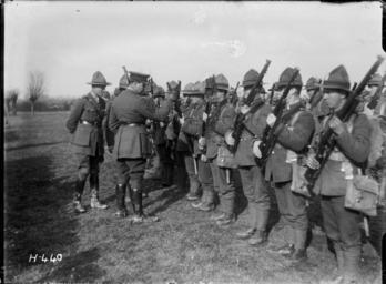 | Keywords: blackandwhite monochrome outdoor people black and white The General Officer Commanding holds a rifle inspection of an Otago battalion stationed in France during World War I. He is standing in front of a row of soldiers and is examining the barrel of a rifle. Photograph taken 3 March 1918 by Henry Armytage Sanders. Inscriptions: Inscribed - Photographer's title on negative -bottom left: H440. Quantity: 1 b&w original negative(s). Physical Description: Dry plate glass negative 4.75 x 6.5 inches The GOC holds rifle inspection of an Otago battalion during World War I. Royal New Zealand Returned and Services' Association :New Zealand official negatives, World War 1914-1918. Ref: 1/2-013062-G. Alexander Turnbull Library, Wellington, New Zealand. natlib.govt.nz/records/22847176 The General Officer Commanding holds a rifle inspection of an Otago battalion stationed in France during World War I. He is standing in front of a row of soldiers and is examining the barrel of a rifle. Photograph taken 3 March 1918 by Henry Armytage Sanders. Inscriptions: Inscribed - Photographer's title on negative -bottom left: H440. Quantity: 1 b&w original negative(s). Physical Description: Dry plate glass negative 4.75 x 6.5 inches The GOC holds rifle inspection of an Otago battalion during World War I. Royal New Zealand Returned and Services' Association :New Zealand official negatives, World War 1914-1918. Ref: 1/2-013062-G. Alexander Turnbull Library, Wellington, New Zealand. natlib.govt.nz/records/22847176 |