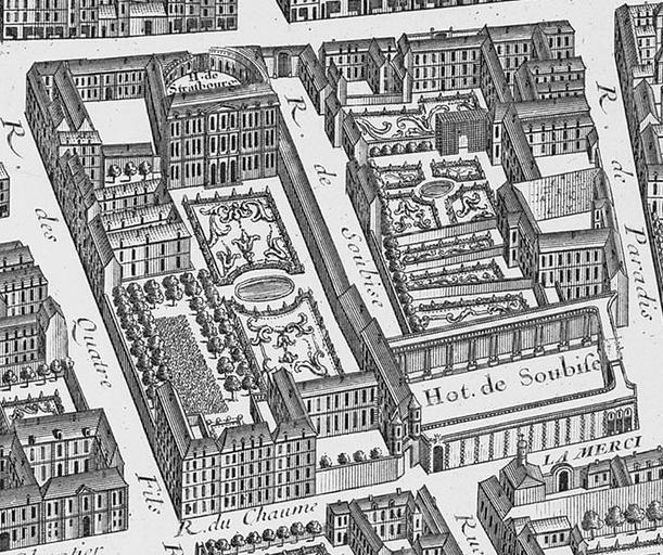 View Original:The_grounds_of_the_Hôtel_de_Soubise_and_Hôtel_de_Strasbourg_(present_Hôtel_de_Rohan)_from_the_Turgot_map_of_Paris_circa_1737.png (743x623)