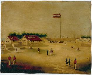 | Keywords: 'The Hawaiian Flag on Honolulu Fort' by Paul Emmert, 1853.jpg The Hawaiian Flag on Honolulu Fort by Paul Emmert 1853 oil on paper board 8 x 10 inches Frazier Fine Art 1853 Creator Paul Emmert <gallery>File 'View of the Honolulu Fort - Interior' oil on canvas painting by Paul Emmert c 1853 Hawaii Historical Society jpg</gallery> Paul Emmert History of Hawaii Flags in art Honolulu Fort Flags of Hawaii Oil on paper PD-old-100 | ||||