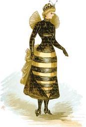 | Keywords: The hornet March1884.png HORNET Short black dress; black satin boots; tunic pointed back and front of black and gold stripes; black satin bodice; green and black gauze wings; cap of black velvet with eyes and antennae of insect Fancy Dresses Described or What to Wear at Fancy Balls; Fourth edition P 70 between page 70 and 71 1884-03 Holt Ardern; T T ; E Meyerstein Litho PD PD-old Hornet costumes Silk in satin weaving standing women in art 1884 lithographs Fashion in 1884 Velvet in art Wasps in art Black and gold |