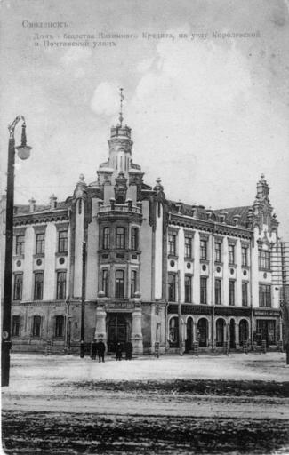 | Keywords: The house of a mutual credit in Smolensk.jpg  en The house of a mutual credit in Smolensk now - the hotel Smolensk Hotel ru Дом общества взаимного к едита в Смоленске ныне - гостиница Смоленск-отель О игинальная отк ытка  е установлены До 1917 года PD-RusEmpire 20th-century postcards of Russia Postcards of Smolensk |