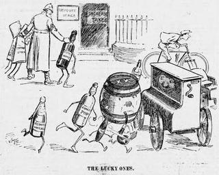 | Keywords: The Lucky Ones - JM Staniforth.png en Political cartoon by JM Staniforth Commentary on a national budget as personifications of alcohol drinks and tobacco flee while foreign wines stocks and bonds are taken to treasury office 'prison' to face increased taxes http //papuraunewyddcymru llgc org uk/en/page/view/3284678 Evening Express Wales Joseph Morewood Staniforth 1899-04-15 Cartoons by Joseph Morewood Staniforth 1890s political cartoons 1899 in the United Kingdom Political cartoons of the United Kingdom Alcohol in art Tobacco in art Bicycles in art Ginger beer Tax in the United Kingdom PD-old-70-1923 |
