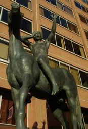 | Keywords: sutton surrey sutton, surrey suttonsurrey sutton, london suttonlondon sculpture sir david wynne sirdavidwynne london london borough of sutton londonboroughofsutton reed the quadrant thequadrant horse horse and rider horseandrider 1981 art statue public art publicart See Wikipedia article: The Messenger is a statue by the English sculptor David Wynne, OBE of a horse and rider. It was installed in the town centre of Sutton in Greater London, England in 1981. Features: The statue features a horse and rider, created in bronze with very dark patination. It is located directly outside the main entrance to Quadrant House (in the Quadrant), adjacent to Sutton railway station. The horse, with a slightly raised left leg, looks towards the station. The rider, seated bareback, raises his left hand in the air above his head and his right hand to his mouth, as if calling out. It is fully life-size and mounted on a 7 foot plinth of marble and granite slabs. The total height is 150 inches. Commissioning and the brief: The statue was commissioned by the then Business Press International Ltd, and upkeep of the work now falls to Reed Business Information, who occupy Quadrant House. It was a major commission for Wynne, which took four years from his first idea and inspiration on receipt of the brief through roughing out, refining and foundry to the final unveiling and installation. The brief given to him by the company was to illustrate the fundamental business of the company, namely communication, but to convey the idea, rather than simply to represent the work of the company in a direct or very obvious way. Location: The company had initially considered that the work should be installed high up, above the entrance lobby. However, Wynne advised against this, feeling that the distance created would militate against the engagement he wanted people to have with the work. It would be perceived as two-dimensional, depriving people of the full three-dimensions they would feel by walking around it. So the statue was installed at ground level in front of the entrance to the building, enabling people to get close up to it. Moment of inspiration: Having agreed the overall idea that the work was to convey, Wynne had to consider what actual form the sculpture would take to best capture the idea of communication. When inspiration came to him, it did so "like a flash of light, complete", as he put it: "A tall wise horse that had never known a bridle, a magic horse if you like, poised, one foot pointing to the centre of the earth; head up, nostrils flared, about to whip round and plunge away. On his back a carefree boy, wild as the horse, calling out to his friends, who have forgotten that they too are heirs to his kingdom." Preparation: As part of his preparation, Wynne visited Italy to see the Equestrian Statue of Marcus Aurelius in Rome and the Horses of Saint Mark in Venice. Unveiling: Describing his thoughts moments before the unveiling, David Wynne wrote in his 1982 book The Messenger. "It is a proud moment for the sculptor when he sees a crowd of expectant and rather puzzled people gazing at an ungainly shrouded shape in the most prominent position outside a gleaming new building. Will they be surprised, pleased, disappointed or even appalled when the cover comes off? Too late to change it now!" Wynne's idea of the relationship between the horse and man: In his introductory essay in the book The Messenger, Lucius Noël notes Wynne's dislike for statues where the horse is shown as merely the support for the rider. Noël notes the way that Wynne highlights the interrelationship between horse and rider in the work, as he did in his previous two horse and rider sculptures. While noting the greater reality in the work than its two equestrian predecessors, he stresses the strong symbolism in the work. He writes: "The rider, a young man, is giving his message to his audience, and seems to be saying that there is another world that all should know about. But the horse is just as important as the man. His is, in fact, more concious than the man, and has his feet firmly planted on the ground, one hoof pointing to the centre of the earth. They are a team, and the overall impression is that each needs the other: man needs the horse, as much as the horse needs man." Noël notes how this analysis ties in with Wynne's wider views about animals: "We must share the Earth with the animals, who have as much right to it as we do. To find a way to live in peace with the animals is our duty." See Wikipedia article: The Messenger is a statue by the English sculptor David Wynne, OBE of a horse and rider. It was installed in the town centre of Sutton in Greater London, England in 1981. Features: The statue features a horse and rider, created in bronze with very dark patination. It is located directly outside the main entrance to Quadrant House (in the Quadrant), adjacent to Sutton railway station. The horse, with a slightly raised left leg, looks towards the station. The rider, seated bareback, raises his left hand in the air above his head and his right hand to his mouth, as if calling out. It is fully life-size and mounted on a 7 foot plinth of marble and granite slabs. The total height is 150 inches. Commissioning and the brief: The statue was commissioned by the then Business Press International Ltd, and upkeep of the work now falls to Reed Business Information, who occupy Quadrant House. It was a major commission for Wynne, which took four years from his first idea and inspiration on receipt of the brief through roughing out, refining and foundry to the final unveiling and installation. The brief given to him by the company was to illustrate the fundamental business of the company, namely communication, but to convey the idea, rather than simply to represent the work of the company in a direct or very obvious way. Location: The company had initially considered that the work should be installed high up, above the entrance 