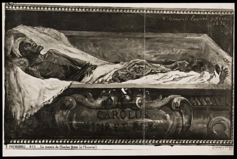 | Keywords: The mummified body of the Emperor Charles V Wellcome L0049794.jpg The mummified body of the Emperor Charles V in the Escorial Photograph of a painting by by V Palmaroli y González <p>Iconographic Collections<br> Keywords Escorial ; name V ; Vicente Palmaroli y González Library reference Iconographic Collection 664511i Photo number L0049794 Full Bibliographic Record http //catalogue wellcomelibrary org/record b1664511 object history exhibition history credit line Wellcome Images http //wellcomeimages org/indexplus/obf_images/25/dd/9d72d7fc50a26b0fad6380883156 jpg Gallery http //wellcomeimages org/indexplus/image/L0049794 html cc-by-4 0 PD-old-100 accession number Images uploaded by Fæ Wellcome L0049794 jpg Mummy of Charles V Holy Roman Emperor Mummies in Spain Vicente Palmaroli 1870s oil on canvas paintings in Spain |
