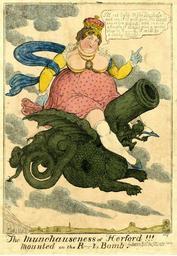 | Keywords: The Munchauseness of Herford!!! Mounted on the R-ts Bomb.jpg en The Munchauseness of Herford Mounted on the R-ts Bomb Lady Hertford Isabella Anne Ingram Shepherd 2nd Marchioness of Hertford pictured sitting astride the giant mortar known as the Regent's Bomb She is pictured holding a match and saying I'll set light to the Touch-ole and see if it will give the Bomb any extra motion and should a couple of Balls give a mortal blow to R-d Richmond it will be a lucky Stroke 1819-05 hand-coloured etching credit line Courtesy of the British Museum London British Museum http //www britishmuseum org/research/search_the_collection_database/search_object_details aspx objectid 1486872 partid 1 searchText ingram fromADBC ad toADBC ad titleSubject on numpages 10 images on orig 2fresearch 2fsearch_the_collection_database aspx currentPage 5 other versions PD-old-100 Isabella Marchioness of Hertford Etchings Satire Cádiz Memorial London |