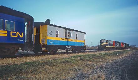 | Keywords: canadian national canadiannational railroad outdoor vehicle train locomotive When I asked the Canadian Railroads Group of Train Orders about these photos, tsokolan responded, "Looks like Roger rode the "Muskeg Mixed" which IIRC was the last mixed train on the CNR. Service was between Edmonton and Fort McMurray AB and ended in the early 1980s." Roger Puta took pictures of the train working at Lac La Biche, Alberta and rode the train from there both in the cab and in the coach. I'm pretty sure he rode to Edmonton. 1. and 2. CN 4603, CN 5517 and CN 4270 at Lac La Biche. CN GP9 4603 GP9 was Northern Alberta Railway 202 and it is now a slug CN 252. CN caboose 79101 (ex. Northern Alberta Railway) at Lac La Biche. When I asked the Canadian Railroads Group of Train Orders about these photos, tsokolan responded, "Looks like Roger rode the "Muskeg Mixed" which IIRC was the last mixed train on the CNR. Service was between Edmonton and Fort McMurray AB and ended in the early 1980s." Roger Puta took pictures of the train working at Lac La Biche, Alberta and rode the train from there both in the cab and in the coach. I'm pretty sure he rode to Edmonton. 1. and 2. CN 4603, CN 5517 and CN 4270 at Lac La Biche. CN GP9 4603 GP9 was Northern Alberta Railway 202 and it is now a slug CN 252. CN caboose 79101 (ex. Northern Alberta Railway) at Lac La Biche. When I asked the Canadian Railroads Group of Train Orders about these photos, tsokolan responded, "Looks like Roger rode the "Muskeg Mixed" which IIRC was the last mixed train on the CNR. Service was between Edmonton and Fort McMurray AB and ended in the early 1980s."