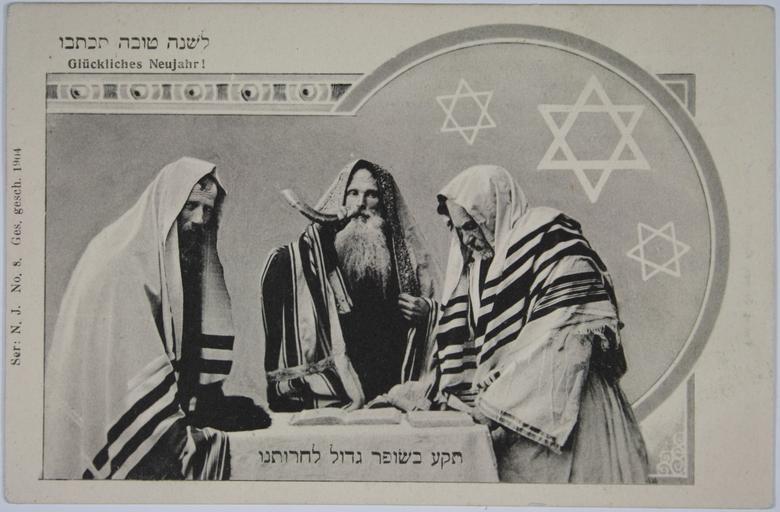 Keywords: The National Library of Israel, Jewish New Year cards C AH 033.JPG ברכות שונה טובה http //web nli org il/sites/NLI/Hebrew/Pages/ContactUS aspx ברכות שנה טובה Jewish New Year cards כרטיס ברכה כבוד ראש השנה ובראשו הברכה ' שנה טובה תכתבו' הג ויה משנת 1904 מתארת תקיעת שופר בבית הכנסת ונראי בה ש ושה אנשי - התוקע ושופר בפיו המקריא את התקיעות ואד נוסף או י החזן עומדי סביב במה הש חן ע יו מניחי את ספרי התורה בעת קריאה בתורה המכוסה במפה וע יה כתוב תקע בשופר גדו חרותנו ברקע נראי ש ושה מגיני דוד Collections of the National Library of Israel 2012-08-15 13 38 54 PD-old Jewish New Year cards |