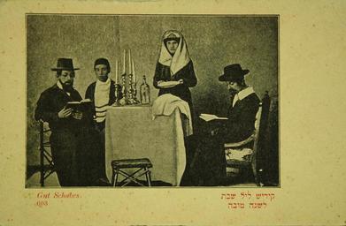 | Keywords: The National Library of Israel, Jewish New Year cards C SH 040.JPG ברכות שונה טובה http //web nli org il/sites/NLI/Hebrew/Pages/ContactUS aspx ברכות שנה טובה Jewish New Year cards ג וית 'שנה טובה' ובה צי ו ש משפחה יהודית מרוסיה ב י שבת ע השו חן נרות בקבוק וח ות מכוסות סביב השו חן יושבי שני גברי וקוראי מתוך ספר אשה נצבת ובידה צ חת מכוסה ו צידה נער בתחתית הג ויה כיתוב קידוש י שבת שנה טובה הג ויה צו מה ע י צ א-יהודי שצי סדרה ש צי ומי אתנוגרפיי ש יהודי רוסיה בשנת 1899 הסדרה הוצגה במוזיאון האתנוגרפי בסנט פטרסבורג באוסף ע ש אנ-סקי בסדרה זו תמונות מבוימות ש אות אנשי בסצנות שונות מתוך התרבות היהודית כשימוש משני בצי ומי הופקה הג ויה ששימשה ככרטיס ברכה שנה החדשה Collections of the National Library of Israel 2012-07-25 10 33 21 PD-old Jewish New Year cards Judaism in Russia |