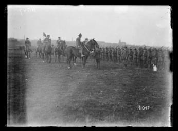 | Keywords: blackandwhite monochrome photo border outdoor black and white A general view of the Prince of Wales visiting New Zealand troops during World War I in Beauvois, France. The Prince on horseback is bending forward to talk to an officer. Soldiers, shouldering arms, stand at attention. Photograph taken 14 October 1918 by Henry Armytage Sanders. Inscriptions: Inscribed - Photographer's title on negative -bottom right: H1047. Quantity: 1 b&w original negative(s). Physical Description: Dry plate glass negative 4 x 5 inches The Prince of Wales visits New Zealand troops, World War I, Beauvois. Royal New Zealand Returned and Services' Association :New Zealand official negatives, World War 1914-1918. Ref: 1/2-013611-G. Alexander Turnbull Library, Wellington, New Zealand. natlib.govt.nz/records/22654635 A general view of the Prince of Wales visiting New Zealand troops during World War I in Beauvois, France. The Prince on horseback is bending forward to talk to an officer. Soldiers, shouldering arms, stand at attention. Photograph taken 14 October 1918 by Henry Armytage Sanders. Inscriptions: Inscribed - Photographer's title on negative -bottom right: H1047. Quantity: 1 b&w original negative(s). Physical Description: Dry plate glass negative 4 x 5 inches The Prince of Wales visits New Zealand troops, World War I, Beauvois. Royal New Zealand Returned and Services' Association :New Zealand official negatives, World War 1914-1918. Ref: 1/2-013611-G. Alexander Turnbull Library, Wellington, New Zealand. natlib.govt.nz/records/22654635 |