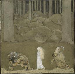 | Keywords: The Princess and the Trolls (John Bauer) - Nationalmuseum - 24305.tif Artwork Creator John Bauer The Princess and the Trolls This illustration with its princess and two trolls is one of several that Bauer produced for author Helena Nyblom s tale Bortbytingarna The Changelings It was published in the fairy-tale anthology Bland tomtar och troll in 1913 The story is about a troll father who is so taken with the little princess Bianca Maria that he steals her from her cradle and replaces her with his own troll child instead The children grow up and neither of them fit in with their new families By the time they reach marrying age the situation has become untenable On their respective wedding days both flee to their own homes and everything is put right again As is often the case Bauer here allows the forest to form a diffuse backdrop in muted colours held together by line-drawn outer contours The tree trunks of the forest are tall and the boulders enormous and they are covered with moss and lichen The background creates a fairy-tale atmosphere and stands in contrast to the foreground which is more detailed and painted in brighter colours Just like in the story Bauer works with opposites in his pictures rich versus poor the frightening and ugly trolls versus the ethereal beauty of the princess the dark and threatening versus the light and good The illustration can be described as more atmospheric than narrative It also works as a stand-alone piece outside the story that it illustrates John Bauer s illustrations for the annual fairytale book Bland tomtar och troll Among Elves and Trolls have shaped generations of Swedish children s perceptions of princesses knights trolls and other fairytale characters Bauer illustrated the anthologies from 1907 1915 with the exception of 1911 and they were so popular that he became something of a household name Prinsessan och trollen har undertiteln En kvÀll vid midsommartid gingo de med Bianca Maria djupt in i skogen Det Àr en av flera bilder som Bauer utförde 1913 till författaren Helena Nybloms saga Bortbytingarna och som publicerades i sagosamlingarna Bland tomtar och troll Sagan handlar om en trollfar som blev sÄ förtjust i den lilla prinsessan att han stjÀl henne ur vaggan och lÀgger dit sin egen unge istÀllet Barnen vÀxer upp och ingen av dem tycks passa in hos sina nya familjer NÀr de blir giftasvuxna flyr bÄda tillbaka till sina ursprungliga hem Genom att Bauer tecknar sina troll sÄ att deras former liknar naturens understryker han trollet som naturvÀsen Trollen tillhör dÀrmed en annan vÀrld Àn mÀnniskornas de saknar sjÀl och stÀlls dÀrför mot prinsessorna som i sin tur har sina rötter i sekelskiftets skildringar av det ideala barnet och som representerar oskuld och naivitet Barnböckernas prinsar och prinsessor skulle transportera den tidens unga betraktare frÄn den yttre verkligheten till en inre drömd vÀrld Böckerna riktades frÀmst till flickor i en period nÀr sexualiteten Ànnu inte ansÄgs vara vÀckt men dÀr fantasin styrdes mot heterosexuell kÀrlek och Àktenskap John Bauers illustrationer till sagosamlingarna Bland tomtar och troll har prÀglat generationer av svenska barn och deras uppfattningar om skogen och dess olika sagovÀsen Vi har idag en enastÄende stark bilderbokstradition men det var redan omkring 1860 som konstnÀrerna ute i Europa började specialisera sig pÄ barnboksillustrationer som ett eget omrÄde Omkring 1880 framtrÀder pÄ barnboksscenen en rad författare de flesta kvinnliga som skriver för barn I Sverige var Ottilia Adelborg och Jenny Nyström pionjÀrer men det var först pÄ 1890-talet tack vare jultidningarnas spridning som en större kÄr av barnboksillustratörer blev verksamma header This illustration with its princess and two trolls is one of several that Bauer produced for author Helena Nyblom s tale Bortbytingarna The Changelings It was published in the fairy-tale anthology Bland tomtar och troll in 1913 The story is about a troll father who is so taken with the little princess Bianca Maria that he steals her from her cradle and replaces her with his own troll child instead The children grow up and neither of them fit in with their new families By the time they reach marrying age the situation has become untenable On their respective wedding days both flee to their own homes and everything is put right again As is often the case Bauer here allows the forest to form a diffuse backdrop in muted colours held together by line-drawn outer contours The tree trunks of the forest are tall and the boulders enormous and they are covered with moss and lichen The background creates a fairy-tale atmosphere and stands in contrast to the foreground which is more detailed and painted in brighter colours Just like in the story Bauer works with opposites in his pictures rich versus poor the frightening and ugly trolls versus the ethereal beauty of the princess the dark and threatening versus the light and good The illustration can be described as more atmospheric than narrative It also works as a stand-alone piece outside the story that it illustrates John Bauer s illustrations for the annual fairytale book Bland tomtar och troll Among Elves and Trolls have shaped generations of Swedish children s perceptions of princesses knights trolls and other fairytale characters Bauer illustrated the anthologies from 1907 1915 with the exception of 1911 and they were so popular that he became something of a household name Prinsessan och trollen har undertiteln En kvÀll vid midsommartid gingo de med Bianca Maria djupt in i skogen Det Àr en av flera bilder som Bauer utförde 1913 till författaren Helena Nybloms saga Bortbytingarna och som publicerades i sagosamlingarna Bland tomtar och troll Sagan handlar om en trollfar som blev sÄ förtjust i den lilla prinsessan att han stjÀl henne ur vaggan och lÀgger dit sin egen unge istÀllet Barnen vÀxer upp och ingen av dem tycks passa in hos sina