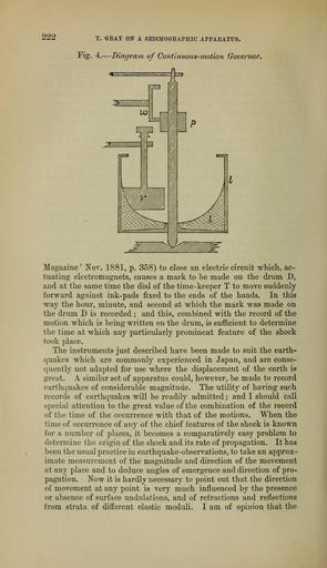 Keywords: The Quarterly journal of the Geological Society of London (13204971914).jpg 222 T GRAY ON A SEISMOGRAPHTC APPARATUS <br> Fig 4 Diagram of Continuous-motion Governor <br> Magazine' Nov 1881 p 358 to close an electric circuit which ac- <br> tuating electromagnets causes a mark to be made on the drum 1 <br> and at the same time the dial of the time- keeper T to move suddenly <br> forward against ink-pads fixed to the ends of the hands In this <br> way the hour minute and second at which the mark was made on <br> the drum D is recorded ; and this combined with the record of the <br> motion which is being written on the drum is sufficient to determine <br> the time at which any particularly prominent feature of the shock <br> took place <br> The instruments just described have been made to suit the earth- <br> quakes which are commonly experienced in Japan and are conse- <br> quently not adapted for use where the displacement of the earth is <br> great A similar set of apparatus could however be made to record <br> earthquakes of considerable magnitude The utility of having such <br> records of earthquakes will be readily admitted ; and I should call <br> special attention to the great value of the combination of the record <br> of the time of the occurrence with that of the motions When the <br> time of occurrence of any of the chief features of the shock is known <br> for a number of places it becomes a comparatively easy problem to <br> determine the origin of the shock and its rate of propagation It has <br> been the usual practice in earthquake-observations to take an approx- <br> imate measurement of the magnitude and direction of the movement <br> at any place and to deduce angles of emergence and direction of pro- <br> pagation Now it is hardly necessary to point out that the direction <br> of movement at any point is very much influenced by the presence <br> or absence of surface undulations and of refractions and reflections <br> from strata of different elastic moduli I am of opinion that the 36928819 113681 51125 Page 222 Text 39 http //www biodiversitylibrary org/page/36928819 1883 Geological Society of London Biodiversity Heritage Library The Quarterly journal of the Geological Society of London v 39 1883 Geology Periodicals Smithsonian Libraries bhl page 36928819 dc identifier http //biodiversitylibrary org/page/36928819 smithsonian libraries Information field Flickr posted date ISOdate 2014-03-16 Check categories 2015 August 26 CC-BY-2 0 BioDivLibrary https //flickr com/photos/61021753 N02/13204971914 2015-08-26 13 53 52 cc-by-2 0 PD-old-70-1923 The Quarterly journal of the Geological Society of London 1883 Photos uploaded from Flickr by FĂŚ using a script |