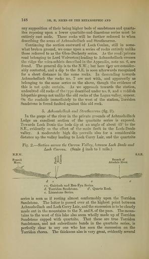 | Keywords: The Quarterly journal of the Geological Society of London (13204607575).jpg 148 <br> DK H HICKS ON THE METAMOEPHIC AND <br> any supposition of their being higher beds of sandstones and quartz- <br> ites reposing upon a lower quartzite-and-limestone series must be <br> entirely cast aside These rocks will be further referred to when <br> describing the areas of Achnashellach and Strathcarron <br> Continuing the section eastward of Loch Coulan still in some- <br> what broken ground we come upon a series of rocks entirely unlike <br> those referred to as the Glen-Docherty series As the road private <br> road belonging to Lord AYolverton leading to Achnashellach crosses <br> the ridge the mica-schists described in the Appendix note no 6 are <br> found The general dip is to the W W ; but here t ey are consider- <br> ably contorted and a dip to the S E is soon afterwards recognized <br> for a short distance in the same rocks In descending towards <br> Achnashellach the rocks no 7 are met with and apparently as <br> belonging to the same series as the above though the evidence of <br> this is not quite certain As we approach towards the station <br> undoubted old rocks of the type described under no 9 aud a reddish <br> felspathic group not unlike the old rocks of the Logan valley appear <br> On the roadside immediately to the west of the station Torridon <br> Sandstone is found faulted against this old rock <br> 5 Achnashellach and Strathcarron fig 2 <br> In the gorge of the river in the private grounds of Achnashellach <br> Lodge an excellent section of the quartzite series is exposed <br> Towards Loch Doule the beds dip at an angle of about 45° to the <br> S E evidently as the effect of the main fault in the Loch-Doule <br> vaJley A moderatelv high dip prevails also for a considerable <br> distance up the valley leading to Loch Cony Lair and the quartzite <br> Eu <br> 2 ” Section across the Carron Valley between Loch Doule and <br> Loch Carron Scale J inch to 1 mile <br> N N -W <br> S S E <br> Branch of <br> Attadale Eiver <br> c Gairloch and Een-Eyn Series <br> d Torridon Sandstone <br> e Limestone Series <br> Quartz Eock <br> series is seen as if resting almost conformably upon the Torridon <br> Sandstone The latter is passed over at the highest point between <br> Achnashellach and Loch Corry Lair and the succession is to be clearly <br> made out in the mountains to the N and S of the pass The moun- <br> tains to the west of this lake also seem wholly made up of Torridon <br> Sandstone capped with quartzite That these are true Torridon <br> Sandstones and not subordinate bands in the quartzite series is <br> perfectly clear to any one who has seen the succession on the <br> Torridon shores The thickness also is very great evidently several 36928733 113681 51125 Page 148 Text 39 http //www biodiversitylibrary org/page/36928733 1883 Geological Society of London Biodiversity Heritage Library The Quarterly journal of the Geological Society of London v 39 1883 Geology Periodicals Smithsonian Libraries bhl page 36928733 dc identifier http //biodiversitylibrary org/page/36928733 smithsonian libraries Information field Flickr posted date ISOdate 2014-03-16 Check categories 2015 August 26 CC-BY-2 0 BioDivLibrary https //flickr com/photos/61021753 N02/13204607575 2015-08-26 13 50 52 cc-by-2 0 PD-old-70-1923 The Quarterly journal of the Geological Society of London 1883 Photos uploaded from Flickr by Fæ using a script |