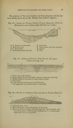 | Keywords: The Quarterly journal of the Geological Society of London (13204855554).jpg NORTH-WEST OF ENGLAND AND NORTH WALES <br> 97 <br> The sections of the two trenches are from diagrams and descrip- <br> tions kindly given me by Mr Martin the resident engineer <br> Eig 13 Section in Yarrow Trench Yarrow Reservoir 1872-75 <br> Horizontal and vertical scales 220 feet to 1 inch <br> s w <br> N E <br> A A Bottom as excavated <br> B Hard grit rock <br> C C Black shale <br> D Soft broken shale and clay <br> E Soft shale <br> I\ Loam sand and veins of gravel <br> G- Gravel <br> H Soil <br> Pig 14 Section of Turner's Side Trench Rivington <br> Scale as in fig 12 <br> 1 Brown clay with boulders <br> 2 Sand and gravel current-bedded together and mixed witb clay <br> 3 Rubble debris of coal-shale in large angular blocks <br> 4 Coal shales <br> At a the clay was not bottomed at 20 feet deep <br> b is supposed to be another section of the gully <br> Fig 15 Section in Cutting on the west side of Yarrow Reservoi/ <br> 1 Yellowish clay 3 feet <br> 2 Brown clay with angular fragments of coal shale <br> 3 Blue clay Till very hard but falls when wet full of pebbles and <br> containing many Millstone-grit boulders up to 8 tons mostly <br> waterworn but none glaciated 36928678 113681 51125 Page 97 Text 39 http //www biodiversitylibrary org/page/36928678 1883 Geological Society of London Biodiversity Heritage Library The Quarterly journal of the Geological Society of London v 39 1883 Geology Periodicals Smithsonian Libraries bhl page 36928678 dc identifier http //biodiversitylibrary org/page/36928678 smithsonian libraries Information field Flickr posted date ISOdate 2014-03-16 Check categories 2015 August 26 CC-BY-2 0 BioDivLibrary https //flickr com/photos/61021753 N02/13204855554 2015-08-26 13 55 04 cc-by-2 0 PD-old-70-1923 The Quarterly journal of the Geological Society of London 1883 Photos uploaded from Flickr by FĂŚ using a script |