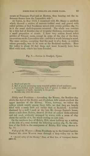 Keywords: The Quarterly journal of the Geological Society of London (13204841444).jpg NORTH-WEST OF ENGLAND AND NORTH WALES t J <br> occurs at Tranmere Pool and at Hooton thus bearing ont the in- <br> ferences drawn from the Lancashire side <br> At Upton in May 1873 I examined with Mr Shone a san dhole <br> which showed a section of current-bedded sand and gravel with <br> rolled pebbles of Red Sandstone mixed with erratic pebbles fig 8 <br> in it the usual shell-fragments occurred The whole was overlain <br> by a thin bed of Boulder-clay of irregular thickness containing only <br> a small proportion of stones I have very seldom found rolled <br> pebbles of Triassic rocks except in some of the clay of the dock- <br> excavations on the Lancashire side ; and this is worth bearing in mind <br> The same section excepting that the sand is of a flesh- or reddish <br> colour generally was to be seen at the Backford sandhole Here <br> the valley is about 50 feet deep and must formerly have been <br> filled with sand which Las been denuded <br> Fig 8 ” Section in Sandpit Upton <br> mm <br> a Sands and gravels <br> b Bed of gravel containing many rounded pebbles of red sandstone <br> c Current-bedded sands containing beds of gravel in which are many <br> fragments of shells especially in the gravel <br> d Boulder-clay with few stones <br> Hehby and Frodsham ” Ascending the Mersey the Boulder-clay <br> skirts the foot of the Helsby and Frodsham hills which overlook the <br> upper marshes of the Mersey When however we follow the <br> valleys which ramify among these hills we find they are largely <br> filled with a sandy drift not unlike that at Backford A section <br> disclosed by a well I sunk at the late Mr George Eastee's house <br> about a mile from Helsby showed 20 feet of yellow flesh-coloured <br> and red sand evidently arranged by water with a seam of clay <br> about the middle of it the whole resting on soft rock <br> On the northern face of Helsby Hill about halfway up a cutting <br> at the side of a road showed the following section fig 9 the rela- <br> tion of the Drift to the escarpment of Helsby Hill being shown in <br> fig 10 <br> Valley of the Weaver ” From Frodsham up to the Grand Junction <br> Yiaduct the river Weaver runs through a deep valley cut in the <br> Buried valley of the Mersey Proc of Greol Soc of Liverpool Session <br> 1872-73 36928674 113681 51125 Page 93 Text 39 http //www biodiversitylibrary org/page/36928674 1883 Geological Society of London Biodiversity Heritage Library The Quarterly journal of the Geological Society of London v 39 1883 Geology Periodicals Smithsonian Libraries bhl page 36928674 dc identifier http //biodiversitylibrary org/page/36928674 smithsonian libraries Information field Flickr posted date ISOdate 2014-03-16 Check categories 2015 August 26 CC-BY-2 0 BioDivLibrary https //flickr com/photos/61021753 N02/13204841444 2015-08-26 13 55 28 cc-by-2 0 PD-old-70-1923 The Quarterly journal of the Geological Society of London 1883 Photos uploaded from Flickr by Fæ using a script |