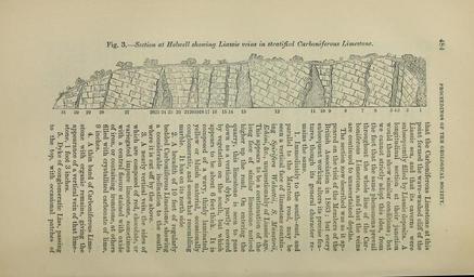 | Keywords: The Quarterly journal of the Geological Society of London (13071204653).jpg 484 <br> PROCEEDINGS OP THE GEOLOGICAL SOCIETY <br> I' <br> be <br> that the Carboniferous Limestone at this <br> point formed the wave-washed cliff of the <br> Liassic sea and that its caverns were <br> subsequently filled by Liassic deposits A <br> longitudinal section at their junction <br> would then show similar conditions ; but <br> we cannot strictly adopt this idea from <br> the fact that the same phenomena prevail <br> throughout the whole line of the Car- <br> boniferous Limestone and that the veins <br> are continued to unascertained depths <br> The section now described was as it ap- <br> peared on the visit of the Members of the <br> British Association in 1863 ; but every <br> subsequent working alters its precise fea- <br> tures though its general character re- <br> mains the same <br> 1 Immediately to the south-east and <br> parallel to the Marston road may be <br> seen a vertical face of limestone contain- <br> ing Spirifera Walcottii S Munsterii <br> Echini c unquestionably of Liassic age <br> This appears to be a continuation of the <br> long face of similar limestone noticed <br> higher up the road On entering the <br> quarry this limestone is seen to pass <br> down as a vertical dyke partly covered <br> by vegetation on the south but which <br> appears to be about 6 feet thick It is <br> composed of a wavy thinly laminated <br> yellow or bluish material occasionally <br> conglomeratic and somewhat resembling <br> marble It has on its north side <br> 2 A breadth of 10 feet of regularly <br> bedded Carboniferous Limestone showing <br> a considerable inclination to the south <br> where it is cut off by the above <br> 3 A nearly vertical vein the sides of <br> which are composed of red chocolate or <br> variegated impure limestone sometimes <br> with a central fissure stained with oxide <br> of iron or containing ironstone at others <br> filled with crystallized carbonate of lime <br> 9 inches <br> 4 A thin band of Carboniferous Lime- <br> stone with organic remains giving the <br> appearance of a vertical vein of that lime- <br> stone 1 foot 3 inches <br> 5 Dyke of conglomeratic Lias passing <br> to the top with occasional patches of 36345239 112028 51125 Page 484 Text v 23 http //www biodiversitylibrary org/page/36345239 1867 Geological Society of London NameFound Echini NameConfirmed Echini NameFound Spirifera NameConfirmed Spirifera NameBankID 4349332 Biodiversity Heritage Library The Quarterly journal of the Geological Society of London v 23 1867 Geology Periodicals Smithsonian Libraries bhl page 36345239 dc identifier http //biodiversitylibrary org/page/36345239 smithsonian libraries Information field Flickr posted date ISOdate 2014-03-10 Check categories 2015 August 26 CC-BY-2 0 BioDivLibrary https //flickr com/photos/61021753 N02/13071204653 2015-08-26 13 53 58 cc-by-2 0 PD-old-70-1923 The Quarterly journal of the Geological Society of London 1867 Photos uploaded from Flickr by Fæ using a script |