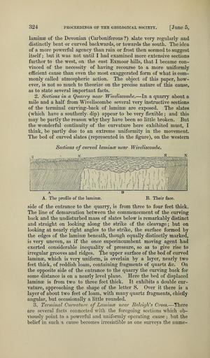 | Keywords: The Quarterly journal of the Geological Society of London (13071345034).jpg 324 <br> PROCEEDINGS OF THE GEOLOGICAL SOCIETY June 5 <br> laminae of the Devonian Carboniferous slate very regularly and <br> distinctly bent or curved backwards or towards the south The idea <br> of a more powerful agency than rain or frost then seemed to suggest <br> itself ; but it was not until I had examined more extensive sections <br> further to the west on the east Exmoor hiUs that I became con- <br> vinced of the necessity of having recourse to a more uniformly <br> efficient cause than even the most exaggerated form of what is com- <br> monly called atmospheric action The object of this paper how- <br> ever is not so much to theorize on the precise nature of this cause <br> as to state several important facts <br> 2 Sections in a Quarry near Wiveliscomhe ” In a quarry about a <br> mile and a half from Wiveliscomhe several very instructive sections <br> of the terminal curving-back of laminae are exposed The slates <br> which have a southerly dip appear to be very flexible ; and this <br> may be partly the reason why they have been so little broken But <br> the wonderful continuity of the curvature here exhibited must I <br> think be partly due to an extreme uniformity in the movement <br> The bed of curved slates represented in the figure on the western <br> Sections of curved lamince near Wiveliscomhe <br> N S_ <br> A The profile of the laminas <br> B Their face <br> side of the entrance to the quarry is from three to four feet thick <br> The line of demarcation between the commencement of the curving <br> back and the undisturbed mass of slates below is remarkably distinct <br> and straight on looking along the strike of the cleavage; but on <br> looking at nearly right angles to the strike the surface formed by <br> the edges of the laminae beneath though equally distinctly marked <br> is very uneven as if the once superincumbent moving agent had <br> exerted considerable inequality of pressure so as to give rise to <br> irregular grooves and ridges The upper surface of the bed of curved <br> laminae which is very uniform is overlain by a layer nearly two <br> feet thick of reddish loam containing fragments of quartz c On <br> the opposite side of the entrance to the quarry the curving back for <br> some distance is on a nearly level plane Here the bed of displaced <br> laminae is from two to three feet thick It exhibits a double cur- <br> vature approaching the shape of the letter S Over it there is a <br> layer of about two feet of loam with many quartz fragments chiefly <br> angular but occasionally a little rounded <br> 3 Terminal Curvature of Lamince near Raleigli's Cross ” There <br> are several facts connected with the foregoing sections which ob- <br> viously point to a powerful and uniformly operating cause ; but the <br> belief in such a cause becomes irresistible as one surveys the nume- 36345077 112028 51125 Page 324 Text v 23 http //www biodiversitylibrary org/page/36345077 1867 Geological Society of London Biodiversity Heritage Library The Quarterly journal of the Geological Society of London v 23 1867 Geology Periodicals Smithsonian Libraries bhl page 36345077 dc identifier http //biodiversitylibrary org/page/36345077 smithsonian libraries Information field Flickr posted date ISOdate 2014-03-10 Check categories 2015 August 26 CC-BY-2 0 BioDivLibrary https //flickr com/photos/61021753 N02/13071345034 2015-08-26 13 52 20 cc-by-2 0 PD-old-70-1923 The Quarterly journal of the Geological Society of London 1867 The Quarterly journal of the Geological Society of London 1867 Photos uploaded from Flickr by Fæ using a script |