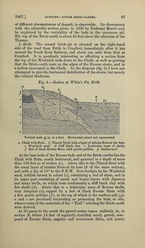 | Keywords: The Quarterly journal of the Geological Society of London (13071063503).jpg 1867 <br> DAWKINS LOWER BRICK-EARTHS <br> 97 <br> of different circum stances of deposit is observable Its discrepancy <br> with the admirable section given in 1838 by Professor Morris may <br> be explained by the variability of the beds in the enormous pit <br> The top of the Brick-earth is about 50 feet above the alluvium of the <br> Thames <br> Erith The second brick-pit is situated on the right-hand <br> side of the road from Erith to Crayford immediately after it has <br> crossed the North Kent Railway and about one mile from that at <br> Crayford It is peculiarly interesting as affording a section from <br> the top of the Woolwich beds down to the Chalk as weU as proving <br> that the Brick-earth rests on the edges of the Eocene strata and in <br> a hollow excavated in the Chalk In the diagram fig 4 I have not <br> attempted to give the horizontal distribution of the strata but merely <br> the vertical thickness <br> Fig 4 ” Section at Whitens Pit Erith <br> Vertical scale in to a foot Horizontal extent not represented <br> a Chalk with flints b Thanet Sand with a layer of tabular flints at the base <br> c Woolwich sand d Stiff black clay e Lenticular mass of shells <br> / Bed of black Eocene flints with quartz pebbles g Surface-soil <br> At the base both of the Eocene beds and of the Brick-earths lies the <br> Chalk with flints nearly horizontal and quarried to a depth of more <br> than 100 feet a of section A Above this is the Thanet Sand with <br> the usual layer of tabular flints- at its base h of the same section <br> and with a dip of 10° to the IS' IN' 'W It is overlain by the Woolwich <br> sand reddish-brown in colour c containing a bed of stone and in <br> its upper part consisting of sandy and loamy layers with Septaria <br> and many shells on which rests conformably a stiff black clay with <br> few shells d Above this is a lenticular mass of Eocene shells <br> very irregular e capped by a bed of black Eocene flints with <br> a few quartz pebbles / at the top of which is the surface-soil g' <br> a and e are peculiarly interesting as presenting the beds in situ <br> whence some of the materials of the Trail covering the Brick-earth <br> were derived <br> At 50 paces to the south the gravel-series comes suddenly in at <br> section B where 14 feet of regularly stratified sandy gravel com- <br> posed of Eocene flints angular and waterworn flints and quartz 36344824 112028 51125 Page 97 Text v 23 http //www biodiversitylibrary org/page/36344824 1867 Geological Society of London NameFound Septaria NameConfirmed Septaria EOLID 2567835 NameBankID 245637 Biodiversity Heritage Library The Quarterly journal of the Geological Society of London v 23 1867 Geology Periodicals Smithsonian Libraries bhl page 36344824 dc identifier http //biodiversitylibrary org/page/36344824 smithsonian libraries Information field Flickr posted date ISOdate 2014-03-10 Check categories 2015 August 26 CC-BY-2 0 BioDivLibrary https //flickr com/photos/61021753 N02/13071063503 2015-08-26 14 57 41 cc-by-2 0 PD-old-70-1923 The Quarterly journal of the Geological Society of London 1867 The Quarterly journal of the Geological Society of London 1867 Photos uploaded from Flickr by Fæ using a script |