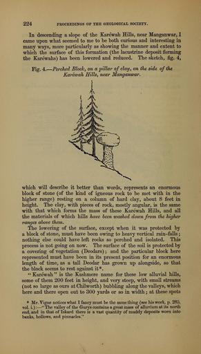 | Keywords: The Quarterly journal of the Geological Society of London (12981404434).jpg 224 <br> PEOCEEDINGS OF THE GEOLOGICAL SOCIETY <br> In descending a slope of the Karewah Hills near Manganwar I <br> came upon wliat seemed to me to be both curious and interesting in <br> many ways more particularly as showing the manner and extent to <br> which the surface of this formation the lacustrine deposit forming <br> the Karewahs has been lowered and reduced The sketch fig 4 <br> Fig 4 ” Perched Block on a pillar of clay on the side of the <br> Karewah Hills near Manganwar <br> which will describe it better than words represents an enormous <br> block of stone of the kind of igneous rock to be met with in the <br> higher range resting on a column of hard clay about 8 feet in <br> height The clay with pieces of rock mostly angular is the same <br> with that which forms the mass of these Karewah Hills and all <br> the materials of which hills have been washed down from the higher <br> ranges above them <br> The lowering of the surface except when it was protected by <br> a block of stone must have been owing to heavy vertical rain-falls ; <br> nothing else could have left rocks so perched and isolated This <br> process is not going on now The surface of the soil is protected by <br> a covering of vegetation Deodars ; and the particular block here <br> represented must have been in its present position for an enormous <br> length of time as a tall Deodar has grown up alongside so that <br> the block seems to rest against it <br> Karewah is the Kashmere name for these low alluvial hills <br> some of them 200 feet in height and very steep with small streams <br> not so large as ours at Clulworth bubbling along the valleys which <br> here and there open out to 300 yards or so in width ; at these spots <br> Mr Vigne notices what I fancy must be the same tiling see his work p 285 <br> vol i ” The valley of the Gm-ys contains a great mass of alluvium at its north <br> end and in that of Iskard there is a vast quantity of muddy deposits worn into <br> banks hollows and pinnacles 36161767 111474 51125 Page 224 Text v 15 http //www biodiversitylibrary org/page/36161767 1859 Geological Society of London Biodiversity Heritage Library The Quarterly journal of the Geological Society of London v 15 1859 Geology Periodicals Smithsonian Libraries bhl page 36161767 dc identifier http //biodiversitylibrary org/page/36161767 smithsonian libraries Information field Flickr posted date ISOdate 2014-03-07 Check categories 2015 August 26 CC-BY-2 0 BioDivLibrary https //flickr com/photos/61021753 N02/12981404434 2015-08-26 14 51 47 cc-by-2 0 PD-old-70-1923 The Quarterly journal of the Geological Society of London 1859 Photos uploaded from Flickr by Fæ using a script |