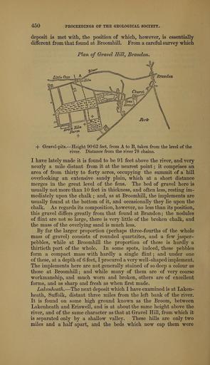 Keywords: The Quarterly journal of the Geological Society of London (12961265145).jpg 450 <br> PKOCEEDIKGS OF THE GEOLOGICAL SOCIETY <br> deposit is met with the position of which however is essentially <br> different from that found at Broomhill From a careful survey which <br> Plan of Gravel Hill Brandon <br> 4// <br> + Gravel-pits ” Height 90-62 feet from A to B taken from the level of the <br> river Distance from the river 78 chains <br> I have lately made it is found to be 91 feet above the river and very <br> nearly a mile distant from it at the nearest point ; it comprises an <br> area of from thirty to forty acres occupying the summit of a hill <br> overlooking an extensive sandy plain which at a short distance <br> merges in the great level of the fens The bed of gravel here is <br> usually not more than 10 feet in thickness and often less resting im- <br> mediately upon the chalk ; and as at Broomhill the implements are <br> usually found at the bottom of it and occasionally they lie upon the <br> chalk As regards its composition however no less than its position <br> this gravel differs greatly from that found at Brandon; the nodules <br> of flint are not so large there is very httle of the broken chalk and <br> the mass of the overlying sand is much less <br> By far the larger proportion perhaps three-fourths of the whole <br> mass of gravel consists of rounded quartzites and a few jasper- <br> pebbles while at Broomhill the proportion of these is hardly a <br> thirtieth part of the whole In some spots indeed these pebbles <br> form a compact mass with hardly a single flint ; and under one <br> of these at a depth of 6 feet I procured a very well-shaped implement <br> The implements here are not generally stained of so deep a colour as <br> those at Broomhill; and while many of them are of very coarse <br> workmanship and much worn and broken others are of excellent <br> forms and as sharp and fresh as when flrst made <br> LaJcenheath ” The next deposit which I have examined is at Laken- <br> heath Suffolk distant three miles from the left bank of the river <br> It is found on some high ground known as the Broom between <br> Lakenheath and Eriswell and is at about the same height above the <br> river and of the same character as that at Gravel Hill from which it <br> is separated only by a shallow valley These hills are only two <br> miles and a half apart and the beds which now cap them were 36103333 111288 51125 Page 450 Text v 25 http //www biodiversitylibrary org/page/36103333 1869 Geological Society of London Biodiversity Heritage Library The Quarterly journal of the Geological Society of London v 25 1869 Geology Periodicals Smithsonian Libraries bhl page 36103333 dc identifier http //biodiversitylibrary org/page/36103333 smithsonian libraries Information field Flickr posted date ISOdate 2014-03-06 Check categories 2015 August 26 CC-BY-2 0 BioDivLibrary https //flickr com/photos/61021753 N02/12961265145 2015-08-26 14 58 35 cc-by-2 0 PD-old-70-1923 The Quarterly journal of the Geological Society of London 1869 Photos uploaded from Flickr by Fæ using a script