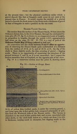 | Keywords: The Quarterly journal of the Geological Society of London (12961051745).jpg TYLOE QUATEENAKY GEAVELS <br> 83 <br> at the present time ; but the physical conditions under which a <br> gravel- deposit like that at Sangatte could occur do not exist at the <br> present time in France It would require the rainfall of a pluvial <br> period to furnish the fresh water to lay down such a thickness of gravel <br> as that of Sangatte in such a position on the sea-coast <br> Thames-Valley Geavels <br> The section from the surface of the Thanet Sands 86 feet above the <br> Ordnance datum-line to the river Thames through the celebrated Cy- <br> rena-pits PI IV fig 6 is drawn to an exaggerated scale of heights <br> in proportion to lengths through the points A E I approximately <br> laid down on the map PI IX PI VII is a copy of part of the <br> Ordnance Parish Map of Grrays reduced to half size <br> An excavation into the chalk between B and C offers an opportu- <br> nity of observing the Thanet Sands quite undisturbed at a distance <br> from the surface of 27 ft at C and of 35 ft at B ; the dip of the <br> chalk is there slightly south the thin covering of gravel e dipping <br> south There is no opportunity of examining the structure of the <br> ground between C and D as it is not excavated ; but I expect the <br> section resembles that at Crayford on the opposite side of the river <br> Fig 16 is a transverse section near the point D showing about <br> w <br> Fig 16 ” Section at Grays Essex <br> D50 <br> E <br> e Covering gravel <br> d False-bedded muds 18 feet thick <br> d' 4-feet pebble-bed with shells Cyrena <br> c <br> c' Elephant-bed <br> c Cyrena-heA 1 foot thick <br> e Mottled clays with Cypris living now in <br> the Thames and impressions of plants <br> 10 feet <br> 18 ft of yellow false-bedded sands d under the covering gravel e <br> and lying upon the 4-feet pebble -bed composed principally of peb- <br> bles from the Woolwich beds of the Eocene series The Cyrena is <br> abundant in the sand of this pebble-bed and occurs associated with <br> other shells in the shell-beds below at c which are from 1 to 4 ft <br> in thickness varying much in character but dipping north to the <br> t 2 36102928 111288 51125 Page 83 Text v 25 http //www biodiversitylibrary org/page/36102928 1869 Geological Society of London NameFound Cypris NameConfirmed Cypris EOLID 14512 NameBankID 2698202 NameFound Cyrena NameConfirmed Cyrena EOLID 4757476 NameBankID 4134596 Biodiversity Heritage Library The Quarterly journal of the Geological Society of London v 25 1869 Geology Periodicals Smithsonian Libraries bhl page 36102928 dc identifier http //biodiversitylibrary org/page/36102928 smithsonian libraries Information field Flickr posted date ISOdate 2014-03-06 Check categories 2015 August 26 CC-BY-2 0 BioDivLibrary https //flickr com/photos/61021753 N02/12961051745 2015-08-26 15 58 09 cc-by-2 0 PD-old-70-1923 The Quarterly journal of the Geological Society of London 1869 Photos uploaded from Flickr by Fæ using a script |
