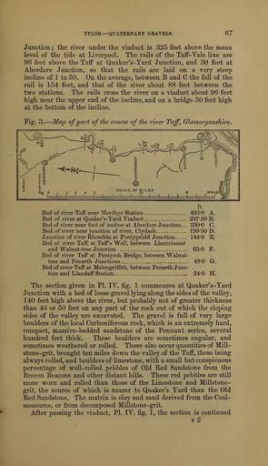 | Keywords: The Quarterly journal of the Geological Society of London (12961165723).jpg TYLOR QUATERNARY GRAVELS <br> 67 <br> Junction ; the river under the viaduct is 325 feet above the mean <br> level of the tide at Liverpool The rails of the Taif-Yale line are <br> 96 feet above the Taff at Quaker's- Yard Junction and 30 feet at <br> Aberdare Junction so that the rails are laid on a very steep <br> incline of 1 in 50 On the average between B and C the fall of the <br> rail is 154 feet and that of the river about 88 feet between the <br> two stations The rails cross the river on a viaduct about 96 feet <br> high near the upper end of the incline and on a bridge 30 feet high <br> at the bottom of the incline <br> Fig 3 ” Map of part of the course of the river Taff Glamorganshire <br> l\ \ -W <br> ft <br> Bed of river Taff near Merthyr Station 4930 A <br> Bed of river at Quaker's-Yard Viaduct 297 50 B <br> Bed of river near foot of incline at Aberdare Junction 230'0 C <br> Bed of river near junction of river Clydach 199-50 D <br> Junction of river Rliondda at Pontypridd Junction 144 0 E <br> Bed of river Taff at Taff's Well betvreen Llantrissant <br> and Walnut-tree Junction 63 0 F <br> Bed of river Taff at Pentyrch Bridge between Walnut- <br> tree and Pen arth Junctions 490 Gr <br> Bed of river Taff at Melengriffith between Penarth Junc- <br> tion and Llandaff Station 240 H <br> The section given in PI lY fig 1 commences at Quaker's-Yard <br> Junction with a bed of loose gravel lying along the sides of the valley <br> 140 feet high above the river but probably not of greater thickness <br> than 40 or 50 feet on any part of the rock out of which the sloping- <br> sides of the valley are excavated The gravel is full of very large <br> boulders of the local Carboniferous rock which is an extremely hard <br> compact massive -bedded sandstone of the Pennant series several <br> hundred feet thick These boulders are sometimes angular and <br> sometimes weathered or rolled There also occur quantities of Mill- <br> stone-grit brought ten miles down the valley of the Taff these being <br> always rolled and boulders of limestone with a small but conspicuous <br> percentage of well-rolled pebbles of Old Eed Sandstone from the <br> Brecon Beacons and other distant hiUs These red pebbles are still <br> more worn and rolled than those of the Limestone and Millstone- <br> grit the source of which is nearer to Quaker's Yard than the Old <br> Red Sandstone The matrix is clay and sand derived from the Coal- <br> measures or from decomposed Millstone -grit <br> After passing the daduct PL lY fig 1 the section is continued <br> 1-2 36102912 111288 51125 Page 67 Text v 25 http //www biodiversitylibrary org/page/36102912 1869 Geological Society of London Biodiversity Heritage Library The Quarterly journal of the Geological Society of London v 25 1869 Geology Periodicals Smithsonian Libraries bhl page 36102912 dc identifier http //biodiversitylibrary org/page/36102912 smithsonian libraries Information field Flickr posted date ISOdate 2014-03-06 Check categories 2015 August 26 CC-BY-2 0 BioDivLibrary https //flickr com/photos/61021753 N02/12961165723 2015-08-26 15 52 05 cc-by-2 0 PD-old-70-1923 The Quarterly journal of the Geological Society of London 1869 Photos uploaded from Flickr by Fæ using a script |