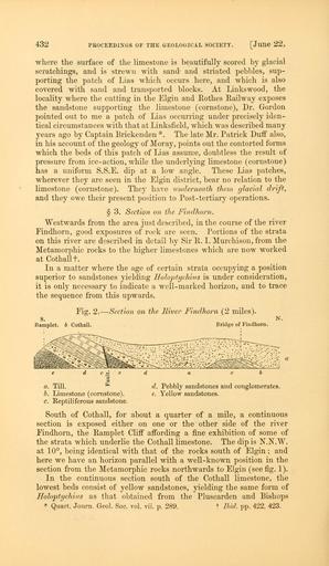 Keywords: The Quarterly journal of the Geological Society of London (12895139683).jpg 432 <br> PKOCEEDINGS OF THE GEOLOGICAL SOCIETY June 22 <br> where the surface of the limestone is beautifully scored by glacial <br> scratchings and is strewn with sand and striated pebbles sup- <br> porting the patch of Lias which occurs here and which is also <br> covered with sand and transported blocks At Linkswood the <br> locality where the cutting in the Elgin and Rothes Railway exposes <br> the sandstone supporting the limestone cornstone Dr Gordon <br> pointed out to me a patch of Lias occurring under precisely iden- <br> tical circumstances with that at Linksfield which was described many <br> j ears ago by Captain Brickenden The late Mr Patrick Duff also <br> in his account of the geology of Moray points out the contorted forms <br> which the beds of this patch of Lias assume doubtless the result of <br> pressure from ice-action while the underlying limestone cornstone <br> has a uniform S S E dip at a low angle These Lias patches <br> wherever they are seen in the Elgin district bear no relation to the <br> limestone cornstone They have underneath them glacial drift <br> and they owe their present position to Post-tertiary operations <br> § 3 Section on the Findhorn <br> Westwards from the area just described in the course of the river <br> Findhorn good exposures of rock are seen Portions of the strata <br> on this river are described in detail by Sir R I Murchi son from the <br> Metamorphic rocks to the higher limestones which are now worked <br> at Cothallt <br> In a matter where the age of certain strata occupying a position <br> superior to sandstones yielding Holoptychius is under consideration <br> it is only necessary to indicate a well-marked horizon and to trace <br> the sequence from this upwards <br> s <br> Fig 2 <br> Raraplet b Cothall <br> -Section on the River Findhorn 2 miles <br> Bridge of Findhorn <br> a Till <br> b Limestone cornstone <br> c Reptiliferous sandstone <br> d Pebbly sandstones and conglomerates <br> e Yellow sandstones <br> South of Cothall for about a quarter of a mile a continuous <br> section is exposed either on one or the other side of the river <br> Findhorn the Ramplet Cliff affording a fine exhibition of some of <br> the strata which underlie the Cothall limestone The dip is N N W <br> at 10° being identical with that of the rocks south of Elgin ; and <br> here we have an horizon parallel with a well-known position in the <br> section from the Metamorphic rocks northwards to Elgin see fig 1 <br> In the continuous section south of the Cothall limestone the <br> lowest beds consist of yellow sandstones yielding the same form of <br> Holoptychius as that obtained from the Pluscarden and Bishops <br> Quart Journ Geol Soc vol vii p 289 t Ibid pp 422 423 36089701 111261 51125 Page 432 Text v 20 http //www biodiversitylibrary org/page/36089701 1864 Geological Society of London NameFound Holoptychius NameConfirmed Holoptychius EOLID 13307203 NameBankID 4196914 Biodiversity Heritage Library The Quarterly journal of the Geological Society of London v 20 1864 Geology Periodicals Smithsonian Libraries bhl page 36089701 dc identifier http //biodiversitylibrary org/page/36089701 smithsonian libraries Information field Flickr posted date ISOdate 2014-03-03 Check categories 2015 August 26 CC-BY-2 0 BioDivLibrary https //flickr com/photos/61021753 N02/12895139683 2015-08-26 16 51 22 cc-by-2 0 PD-old-70-1923 The Quarterly journal of the Geological Society of London 1864 Photos uploaded from Flickr by Fæ using a script
