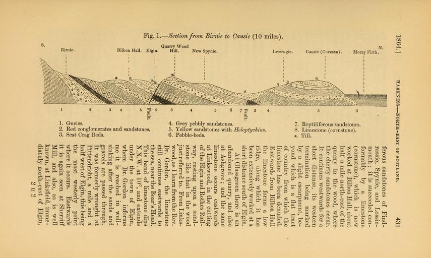 Keywords: The Quarterly journal of the Geological Society of London (12895460204).jpg 1864 <br> HARKNESS NORTH-EAST OF SCOTLAND <br> 431 <br> pq <br> P3 <br> PQ <br> o <br> Fault <br> 8 <br> J- <br> c c <br> eS O <br> to -u <br> TS oo <br> e3 © <br> DO Q <br> £ © © <br> 0 hPh <br> t 5 id CD <br> Fault <br> tc <br> S3 <br> c3 <br> 00 <br> C <br> © T3 <br> sd ® <br> §W <br> S S <br> oo O r v <br> '© t3 t» <br> C © g <br> OPhCC <br> i- Hco <br> ferous sandstones of Find- <br> rassie Spynie and Lossie- <br> mouth ; it is succeeded con- <br> formably by a limestone <br> cornstone which is now <br> worked at Bilboa Hall about <br> half a mile north-east of the <br> quarry in the wood where <br> the cherty sandstones occur <br> It continues westwards for a <br> short distance its western <br> termination being marked <br> by a slight escarpment be- <br> yond which is a flat tract <br> of country from which the <br> limestone has been denuded <br> Eastwards from Bilboa Hall <br> the limestone forms a low <br> ridge along which it has <br> been extensively worked at a <br> short distance south of Elgin <br> At Glassgreen there is an <br> abandoned quarry and also <br> at Ashgrove ; and the same <br> limestone occurs eastwards <br> at Linkswood in the cutting <br> of the Elgin and Rothes Kail- <br> way resting upon a sand- <br> stone like that in the wood <br> just referred to From Links- <br> wood as I learn from the Rev <br> Dr Gordon the limestone <br> still continues eastwards to <br> the sea near the Boar's Head <br> This band of limestone dips <br> N N W at 10° and extends <br> under the town of Elgin <br> where Dr Gordon informs <br> me it is reached in well- <br> sinking after the sands and <br> gravels are passed through <br> It was formerly wrought at <br> Pittendricht a mile and a <br> half west of Elgin this being <br> the most westerly point <br> where it occurs Eastwards <br> it is again seen at Sherriff <br> Mill and also as is well <br> known at Linksfield imme- <br> diately north-east of Elgin <br> 2h2 36089700 111261 51125 Page 431 Text v 20 http //www biodiversitylibrary org/page/36089700 1864 Geological Society of London Biodiversity Heritage Library The Quarterly journal of the Geological Society of London v 20 1864 Geology Periodicals Smithsonian Libraries bhl page 36089700 dc identifier http //biodiversitylibrary org/page/36089700 smithsonian libraries Information field Flickr posted date ISOdate 2014-03-03 Check categories 2015 August 26 CC-BY-2 0 BioDivLibrary https //flickr com/photos/61021753 N02/12895460204 2015-08-26 16 57 11 cc-by-2 0 PD-old-70-1923 The Quarterly journal of the Geological Society of London 1864 Photos uploaded from Flickr by Fæ using a script |