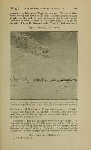 | Keywords: The Quarterly journal of the Geological Society of London (12894092774).jpg Vol 53' ROCKS AND FOSSILS FROM FKANZ JOSEF LAND <br> 481 <br> determined by him to be of Upper Jurassic age The fact of these <br> fossils having been found on the basalt also influenced Dr Nansen <br> in referring this rock in part at least to the Jurassic period <br> Evidences of recent changes in the relative level of land and sea <br> are referred to in Dr Hansen's book Thus Mr Jackson's hut is <br> Fig 2 ” Elmwood Cape Flora <br> broin a photograph ” This view shows the exposure of basaits above and the <br> huts of the Expedition below the talus-heaps which are here covered by snow <br> built on an old beach 40 to 50 feet above sea-level and other <br> beaches were found at still greater elevations Raised beaches <br> were also observed farther north in the neighbourhood of the hut <br> in which Dr Nansen wintered <br> A number of geological specimens were sent home by Mr Jack- <br> son and his party when the Windward returned in 1895 and a <br> short note on some of these was appended by our colleague Mr G <br> Sharman and one of us to Mr Montefiore Brice's report of the <br> expedition 1 The much larger series of specimens of both rocks and <br> 1 Geogr Journ vol vi 1895 p 518 <br> Q J G S No 212 k 36029326 111130 51125 Page 481 Text 53 http //www biodiversitylibrary org/page/36029326 1897 Geological Society of London Biodiversity Heritage Library The Quarterly journal of the Geological Society of London v 53 1897 Geology Periodicals Smithsonian Libraries bhl page 36029326 dc identifier http //biodiversitylibrary org/page/36029326 smithsonian libraries Information field Flickr posted date ISOdate 2014-03-03 Check categories 2015 August 26 CC-BY-2 0 BioDivLibrary https //flickr com/photos/61021753 N02/12894092774 2015-08-26 16 51 31 cc-by-2 0 PD-old-70-1923 The Quarterly journal of the Geological Society of London 1897 Photos uploaded from Flickr by Fæ using a script |