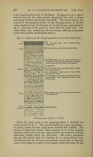 | Keywords: The Quarterly journal of the Geological Society of London (12893721523).jpg 428 <br> MR E P RIQKARDS ON THE GRAVELS AND Allg 1897 <br> is the lowest gravel found at Newbury It appears to be a gravel <br> derived from all the other gravels mentioned but with <br> a larger <br> percentage of flints direct from the Chalk The finest section was <br> exposed at the pumping-station of the drainage-works in the flat <br> water-meadows near the Kennet on Cook's Farm represented by <br> fig 5 The base of the gravel is about 240 feet above O D The <br> white flinty clay underlying this was sticky adhering tenaciously <br> to the flint-nodules intermingled with it <br> Fig 5 ” Section at the Pumping-station of the Drainage-works <br> I0h feet <br> feet <br> 5 feet <br> exposed <br> 9 C° <br> 'V'CF <br> fa <br> – IP <br> -ifo <br> aV 5 <br> a <br> Peaty soil and peat with Neolithic flint- <br> implements <br> Stiff pale yellow sandy homogeneous clay <br> Clean flint-shingle grey in colour sarsens up to <br> 12 inches in diameter near the base and small <br> chalk-fragments intermingled throughout <br> Composition <br> 70 brown flints most of them nearly rounded <br> the rest subangular; <br> 20 0/ subangular white-coated black flints <br> black where worn ; <br> 10 0/ subangular ferruginous gritstone green- <br> coated flints large subangular sarsens and <br> flint-nodules <br> White sandy clay with black flint-nodules and <br> chalk- fragments <br> Chalk-with-flints <br> Vertical scale \ inch 1 foot <br> About 30 yards north of the pumping-station I obtained the <br> section shown in fig 6 This gravel usually has a grey appearance <br> the flints unless rounded being much battered and abraded The <br> matrix is frequently absent; when present it is of the cleanest <br> quartzose sand and rarely the upper portion has a matrix of white <br> shell-marl loosely filling the interstices The water percolated <br> through this gravel into our sinkings at an extraordinary rate <br> necessitating the use of three steam-pumps at one time to keep the <br> water from rising in a shaft 19 feet square when only sunk 15 feet 36029251 111130 51125 Page 428 Text 53 http //www biodiversitylibrary org/page/36029251 1897 Geological Society of London Biodiversity Heritage Library The Quarterly journal of the Geological Society of London v 53 1897 Geology Periodicals Smithsonian Libraries bhl page 36029251 dc identifier http //biodiversitylibrary org/page/36029251 smithsonian libraries Information field Flickr posted date ISOdate 2014-03-03 Check categories 2015 August 26 CC-BY-2 0 BioDivLibrary https //flickr com/photos/61021753 N02/12893721523 2015-08-26 16 57 19 cc-by-2 0 PD-old-70-1923 The Quarterly journal of the Geological Society of London 1897 Photos uploaded from Flickr by Fæ using a script |