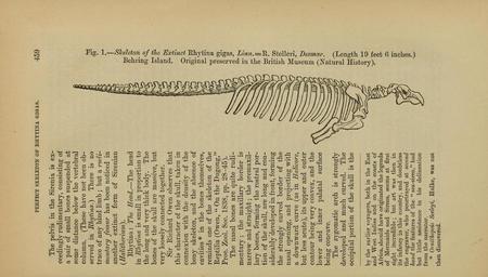 | Keywords: The Quarterly journal of the Geological Society of London (14053352106).jpg PERFECT SKELETON OF RHTTINA GIGAS <br> 459 <br> The pelvis in the Sirenia is ex- <br> ceedingly rudimentary consisting of <br> a pair of small bones suspended at <br> some distance below the vertebral <br> column These have not been ob- <br> served in Kfiytina There is no <br> trace of any hind limb ; but a rudi- <br> mentary femur has been noticed in <br> another extinct form of Sirenian <br> HalWierimri <br> Ehytina The ITead ”The head <br> in Rhytina is small in proportion to <br> the long and very thick body The <br> bones of the skull are massive but <br> very loosely connected together <br> Sir Eichard Owen observes that <br> this character of the skull taken in <br> connexion with the density of the <br> bony skeleton and the absence of <br> cavities in the bones themselves <br> reminds one of the skeleton of the <br> Eeptilia Owen On the Dugong <br> Proc Zool Soc 1838 pp 28-45 <br> The nasal bones are quite rudi- <br> mentary ; the maxillary border is <br> narrow and straight ; the premaxil- <br> lary bones forming the rostral por- <br> tion of the skull are long and con- <br> siderably developed in front forming <br> the strongly curved border of the <br> nasal opening and projecting with <br> a downward curve as in Hcdicore <br> but less acute its upper and outer <br> contour being very convex and the <br> lower and inner palatal surface <br> being concave <br> The zygomatic arch is strongly <br> developed and much curved The <br> occipital portion of the skull is the <br> by tlie earlier Toyagers both in the East <br> and West Indies and on the coasts of <br> Africa should hare originated the legends <br> of Mermaids and Sirens seems at first <br> sight incredible ; but art was then in <br> its infancy in this country and doubtless <br> the engraver who pourtrayed at seco7id <br> hand the features of the sea-siren had <br> but little assistance in his delineation <br> from the narrator <br> Ornithopsis Seeleyi Hulke was not <br> then discovered <br> <br> § <br> ' <br> E-s <br> H' <br> «- <br> <br> \ ” <br> <br> CO <br> -l <br> ' C5 <br> p <br> C3 <br> » <br> <br> r <br> <br> c <br> 3 <br> – <br> C-'i <br> ¢ P- <br> c <br> – <br> p <br> c-l <br> f ” ' <br> p' <br> <br> p <br> »-s <br> s <br> a <br> tn <br> - <br> CD <br> cr <br> <br> p <br> <br> vi° <br> o <br> Pj <br> b <br> »« <br> P <br> ; <br> e-h <br> s <br> O <br> II <br> W <br> m <br> K- ' <br> CO <br> a <br> P <br> <br> 2 <br> P <br> b <br> p <br> cS <br> e <br> Co <br> - ” <br> S5 <br> <br> - <br> p <br> c+- <br> ¢ <br> p <br> r <br> w <br> en <br> 5q <br> P- <br> ct- <br> o <br> t ” <br> <br> CO <br> l-t <br> t <br> o <br> CD <br> c1- <br> Ci <br> _ <br> P <br> o <br> p- <br> « 37047329 114009 51125 Page 459 Text 41 http //www biodiversitylibrary org/page/37047329 1885 Geological Society of London NameFound Ehytina NameFound Gigas NameConfirmed Gigas NameBankID 5095720 NameFound Kfiytina NameFound Ornithopsis NameConfirmed Ornithopsis NameBankID 4270321 NameFound Rhttina NameFound Rhytina NameConfirmed Rhytina NameBankID 4332298 NameFound Sirenia NameConfirmed Sirenia EOLID 8708 NameBankID 2482684 Biodiversity Heritage Library The Quarterly journal of the Geological Society of London v 41 1885 Geology Periodicals Smithsonian Libraries bhl page 37047329 dc identifier http //biodiversitylibrary org/page/37047329 smithsonian libraries Information field Flickr posted date ISOdate 2014-04-30 Check categories 2015 August 26 CC-BY-2 0 BioDivLibrary https //flickr com/photos/61021753 N02/14053352106 2015-08-26 04 59 18 cc-by-2 0 PD-old-70-1923 The Quarterly journal of the Geological Society of London 1885 Photos uploaded from Flickr by Fæ using a script |