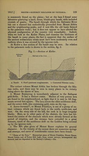 Keywords: The Quarterly journal of the Geological Society of London (12826739014).jpg 1857 <br> SMYTH EXTINCT VOLCANOS OF VICTORIA <br> 229 <br> is commonly found on the plains ; but at the base I found some <br> labourers quarrying a hard dense bluish-grey basalt with included <br> crystals of quartz The basalt through which the Saltwater River <br> has cut a channel has undoubtedly proceeded from Mount Aitkin <br> and the neighbouring peaks and it now fills the old basin formed <br> in the palaeozoic rocks ; but it does not appear to have altered the <br> physical configuration of the country very remarkably Indeed <br> when we look at the Keilor Plains and examine the thickness of <br> the basalt in many places the fact is apparent that the surface of <br> the ancient sedimentary strata must have been moderately even and <br> uniform when it was covered by the igneous rock <br> At Keilor a fine section of the basalt may be seen Its relation <br> to the palaeozoic rocks is shown in the section fig 2 <br> Fig 2 ” Section at Keilor <br> 1 i ' i i ˘ ' i i <br> a Basalt b Hard quartzose conglomerate c Contorted Silurian rocks <br> The extinct volcano Mount Aitkin has broken through the Silu- <br> rian rocks and these may be seen in many places in its vicinity <br> rising above the sheets of lava <br> 3 Mount Boninyong is immediately adjacent to the Ballaarat <br> gold-fields It has a distinct crater Masses of very porous lava <br> are found in the neighbourhood so light that it is easy to lift frag- <br> ments several feet square The lava covers the older auriferous drift; <br> and the newer drift also containing gold rests on the top <br> 4 Lame-bar amul or Mount Franklyn is one of a group of ex- <br> tinct volcanos which are found both to the north south-east and <br> west On the steep side of the hill the rock is in huge irregular <br> blocks Here as in other parts of the district the lava has fol- <br> lowed the course of the channels which were already formed at the <br> period of eruption and the streams have extended to a great <br> distance much of the auriferous drift on the Loddon being covered <br> up by the igneous rock <br> 5 The MS plan given of Mount Rouse explains its general <br> character In the vicinity of the mount there are numerous springs <br> and swamps and caves of considerable extent have been found <br> Home of the Emu Manuscript plans of Mount Franklyn Mount Rouse <br> Mount Leura and of Tower Hill Lake from recent surveys accompanied this <br> memoir and are deposited in the Society's Library ” Ed 36214197 111684 51125 Page 229 Text v 14 http //www biodiversitylibrary org/page/36214197 1858 Geological Society of London Biodiversity Heritage Library The Quarterly journal of the Geological Society of London v 14 1858 Geology Periodicals Smithsonian Libraries bhl page 36214197 dc identifier http //biodiversitylibrary org/page/36214197 smithsonian libraries Information field Flickr posted date ISOdate 2014-02-28 Check categories 2015 August 26 CC-BY-2 0 BioDivLibrary https //flickr com/photos/61021753 N02/12826739014 2015-08-26 17 54 03 cc-by-2 0 PD-old-70-1923 The Quarterly journal of the Geological Society of London 1858 Photos uploaded from Flickr by Fæ using a script |