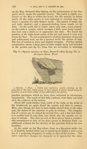 | Keywords: The Quarterly journal of the Geological Society of London (12736464255).jpg 780 <br> E HILL AND T ft BONNET ON THE <br> on the Map Stcward's-Hay Spring on the continuation of the blue <br> patch which marks the quartzite quarry The patch is rightly con- <br> tinued on the Map to within the wood ; but the syenite on which <br> nearly all the latter grows is only indicated as existing near the <br> house a quarter of a mile further north The quarry is small old <br> and quite shallow ; and a pheasant-feeding house stands on its <br> floor On the north side is rather coarse ashy slate much jointed ; <br> on the south is syenite which becomes a little more finely crystal- <br> line but only a little as it approaches the slate We found the <br> junction at the right-hand corner of the pit and traced it some way <br> across the floor No one accustomed to examine junctions of igneous <br> and sedimentary rock can for a moment donbt the nature of this <br> The line of contact is wavy and slightly irregular Further careful <br> examination shows a large piece of slate caught up by and included <br> in the syenite see fig 6 ; from this we succeeded in obtaining <br> Fig 6 ” Syenite intrusive in Slate Steward' s-Hay Spring Pit in <br> Bradtjate-House Wood <br> a Syenite b Slate c Debris and vegetation partly covering up the <br> joint-face of the slate which seems to have passed in places almost along the <br> junction so as to leave a flake of slate adhering to the syenite <br> junction specimens which we have since subjected to microscopic <br> examination The result of this fully confirms were there any need <br> of it the evidence of the section <br> About 250 yards further west north of the walk in the midst of <br> the brushwood we again found the syenite and slate in contact <br> Here also though the slate is more highly altered than at the other <br> spot the nature of the junction is quite as evident The irregular <br> line of contact can be traced for several feet ; and a few feet below <br> it is another bed of ashy slate into which also the syenite can be <br> seen to intrude The slate at each of these places bears a consider- <br> able resemblance to that of the slate-quarry in Bradgate Park ” an <br> additional evidence for the identity of the quartzite beds in the two <br> localities <br> At the point on the Map where there is a dip-arrow under the <br> L of Linford banded slates can be traced up to within a yard even <br> less if a projecting fragment be really in situ of the syenite The <br> latter somewhat changes its character as it approaches the slate 35818963 110705 51125 Page 786 Text 33 http //www biodiversitylibrary org/page/35818963 1877 Geological Society of London Biodiversity Heritage Library The Quarterly journal of the Geological Society of London v 33 1877 Geology Periodicals Smithsonian Libraries bhl page 35818963 dc identifier http //biodiversitylibrary org/page/35818963 smithsonian libraries Information field Flickr posted date ISOdate 2014-02-24 Check categories 2015 August 26 CC-BY-2 0 BioDivLibrary https //flickr com/photos/61021753 N02/12736464255 2015-08-26 19 53 51 cc-by-2 0 PD-old-70-1923 The Quarterly journal of the Geological Society of London 1877 Photos uploaded from Flickr by Fæ using a script |