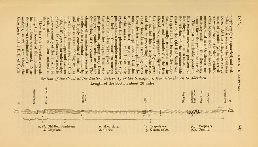 | Keywords: The Quarterly journal of the Geological Society of London (12712048644).jpg 1855 <br> NICOL GRAMPIANS <br> 547 <br> porphyry p is quarried and a si- <br> milar bed is seen on the coast near <br> Cove At this village also a large <br> mass of granite g is quarried <br> As we approach Aberdeen granite- <br> veins become more and more nu- <br> merous until near Girdleness im- <br> mediately south of the Dee they <br> almost form the predominant rock <br> The most remarkable points in <br> this section are ” the position of <br> the clayslate and mica-slate and <br> the relation of the metamorphic <br> strata to the Old Red Sandstone <br> In regard to the former the clay- <br> slate usually considered as the <br> newer and undoubtedly the less <br> altered rock appears to dip under <br> the older mica-slate My impres- <br> sion is that this is truly the case <br> and that in proceeding along the <br> coast there is an ascending series <br> from the less metamorphic to the <br> more metamorphic rock But this <br> could not be the original position <br> of the masses ; and I can only <br> explain the phsenomenon by sup- <br> posing that a complete inversion of <br> the beds on the southern margin <br> of the chain has taken place In <br> the north they regain their ori- <br> ginal position dipping away from <br> the great granitic axis or rather <br> foundation of the country The <br> change of inclination also seems to <br> be effected in a peculiar manner by <br> the highly convoluted mica-slate <br> and gneiss strata folding up as <br> it were on themselves and thus <br> pushing out the upper and exterior <br> beds as if by great intruded wedges <br> of rock It is thus an instance in <br> our own country of the fan-shaped <br> stratification so often noticed in <br> the Alps <br> How far this inversion extends <br> along the border of the mountains <br> has not been determined Near <br> the western termination of the for- <br> mations as well seen along the <br> Gare Loch on the Firth of Clyde <br> i 5 <br> o <br> 0 1 <br> o <br> CM <br> O <br> a <br> So V <br> I <br> § J <br> to <br> so <br> So <br> «C <br> so <br> So <br> 2c <br> ¢J3Al I UOd <br> ¢uaapjaqv <br> ¢J3Aia 33CI <br> ¢asnotimSiq <br> SS3U9lpil9 <br> ¢3A0Q <br> ¢;U10J UOJJBQ <br> ¢uaA«iiauo S <br> i;3'TS <br> - So <br> k£ 35615159 110213 51125 Page 547 Text v 11 http //www biodiversitylibrary org/page/35615159 1855 Geological Society of London Biodiversity Heritage Library The Quarterly journal of the Geological Society of London v 11 1855 Geology Periodicals Smithsonian Libraries bhl page 35615159 dc identifier http //biodiversitylibrary org/page/35615159 smithsonian libraries Information field Flickr posted date ISOdate 2014-02-23 Check categories 2015 August 26 CC-BY-2 0 BioDivLibrary https //flickr com/photos/61021753 N02/12712048644 2015-08-26 20 54 28 cc-by-2 0 PD-old-70-1923 The Quarterly journal of the Geological Society of London 1855 Photos uploaded from Flickr by Fæ using a script |
