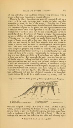 | Keywords: The Quarterly journal of the Geological Society of London (12711967564).jpg HISLOP AND HUNTER NAGPUR 357 <br> of trap extending over sandstone without being associated with a <br> second sedimentary formation or volcanic effusion <br> Though the three formations are generally connected with each <br> other yet it is chiefly the upper one viz the overlying trap that <br> meets the eye over the face of the country Leaving out of con- <br> sideration the very few examples of denudation which have uncovered <br> the freshwater deposit in the plains and the equally rare instances <br> of eruption which have there upheaved it on its edge it is on the <br> escarpments of the table-lands that we may be said to gain our whole <br> knowledge of this department of Nagpur geology In commencing <br> our ascent of these steep hills our attention is attracted by a number <br> of blocks near the foot which are easily distinguished from the <br> masses of basalt among which they have fallen from above As we <br> make our way up over the hard dark vesicular rock the blocks in- <br> crease in number until we come to a friable greyish or bluish-green <br> zone We must now move slowly and look narrowly for a few <br> 5 ards of upward progress may conduct us from the soft amygdaloid <br> where fragments are thickly strewed to a nodular basalt where not <br> a trace of them is to be seen Occasionally the freshwater forma- <br> tion is so thin that a very little earth or herbage may suffice to hide <br> it from our sight But generally the water from the brow of the <br> hill in the monsoon collects into little rills just at the place where it <br> leaves the nodular trap and having now gathered enough of strength <br> to make an impression on intervening barriers it proceeds to plough <br> up the soft deposit and the still softer subjacent amygdaloid leaving <br> an interval between each streamlet like a talus resting on the harder <br> vesicular rock below see fig 2 The thickness of the overlying <br> trap on Sitabaldi Hill and the tabulated summits in its immediate <br> vicinity is from 15 to 20 feet which agrees very exactly with the <br> Fig 2 Sectional View of one of the Trap Hills near Nagpur <br> a Surface soil c Freshwater deposit <br> b Nodular trap 15 to 20ft thick d Soft amygdaloid e Hard amygdaloid <br> thickness assigned to it by Dr Voysey at Jillan On the Western <br> Ghats however according to Colonel Sykes a stratum of earthy <br> jasper which is just our freshwater deposit was found near Junar <br> under a thickness of from 300 to 600 feet of basalt But it not <br> unfrequently happens that in leaving the plain and climbing up a <br> Trans Geol Soc 2 ser vol iv p 419 35614945 110213 51125 Page 357 Text v 11 http //www biodiversitylibrary org/page/35614945 1855 Geological Society of London Biodiversity Heritage Library The Quarterly journal of the Geological Society of London v 11 1855 Geology Periodicals Smithsonian Libraries bhl page 35614945 dc identifier http //biodiversitylibrary org/page/35614945 smithsonian libraries Information field Flickr posted date ISOdate 2014-02-23 Check categories 2015 August 26 CC-BY-2 0 BioDivLibrary https //flickr com/photos/61021753 N02/12711967564 2015-08-26 20 58 55 cc-by-2 0 PD-old-70-1923 The Quarterly journal of the Geological Society of London 1855 Photos uploaded from Flickr by FĂŚ using a script |