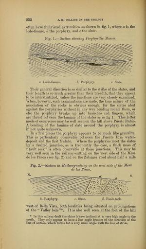 Keywords: The Quarterly journal of the Geological Society of London (13889826060).jpg 252 <br> J H COLLIJS'S ON THE GEOLOGY <br> often have fimbriated extremities as shown in fig 1 where a is the <br> lode-fissure 6 the porphyry and c the slate <br> Fig 1 ” Section showing Forpliyritic Masses <br> a Lode-fissure <br> h Porphyry <br> Slate <br> Their general direction is so similar to the strike of the slates and <br> their length is so much greater than their breadth that they appear <br> to be interstratified unless the junctions are very closely examined <br> When however such examinations are made the true nature of the <br> association of the rocks is obvious enough for the slates abut <br> against the porphyries without in any way bending round them or <br> else the porphyry breaks up into branches and fingers which <br> are thrust between the laminae of the slates as in fig 1 This latter <br> mode of occurrence may be well seen on the hill above Puerto Eubio <br> A bending of the laminas of slate around the porphyry is almost <br> if not quite unknown <br> In a few places the porphyrj appears to be much like granulite <br> This is particularly observable between the Fuente Fria water- <br> deposit and the first llalaiio Where the porphyries meet the slates <br> by a faulted junction as is frequently the case a thick mass of <br> fault rock is often observable at these junctions This may be <br> verj well seen in the railway- cutting on the west side of the Mesa <br> de los Pinos see fig 2 and on the Zalamea road about half a mile <br> Fig 2 ” Section in Railway -cutting on the luest side of the Mesa <br> de los Pinos <br> h Porphyry <br> Slafce <br> d Fault-rock <br> west of Bella Yista both localities being situated oii prolongations <br> of the Yalley lode It is also well seen at the foot of the hill <br> In this railway -fault the slates c are inclined at a very high angle to the <br> north They only appear to have a low angle because of the direction of the <br> line of section which forms but a very small angle with the line of strike 37047108 114009 51125 Page 252 Text 41 http //www biodiversitylibrary org/page/37047108 1885 Geological Society of London Biodiversity Heritage Library The Quarterly journal of the Geological Society of London v 41 1885 Geology Periodicals Smithsonian Libraries bhl page 37047108 dc identifier http //biodiversitylibrary org/page/37047108 smithsonian libraries Information field Flickr posted date ISOdate 2014-04-30 Check categories 2015 August 26 CC-BY-2 0 BioDivLibrary https //flickr com/photos/61021753 N02/13889826060 2015-08-26 04 56 10 cc-by-2 0 PD-old-70-1923 The Quarterly journal of the Geological Society of London 1885 Photos uploaded from Flickr by Fæ using a script |